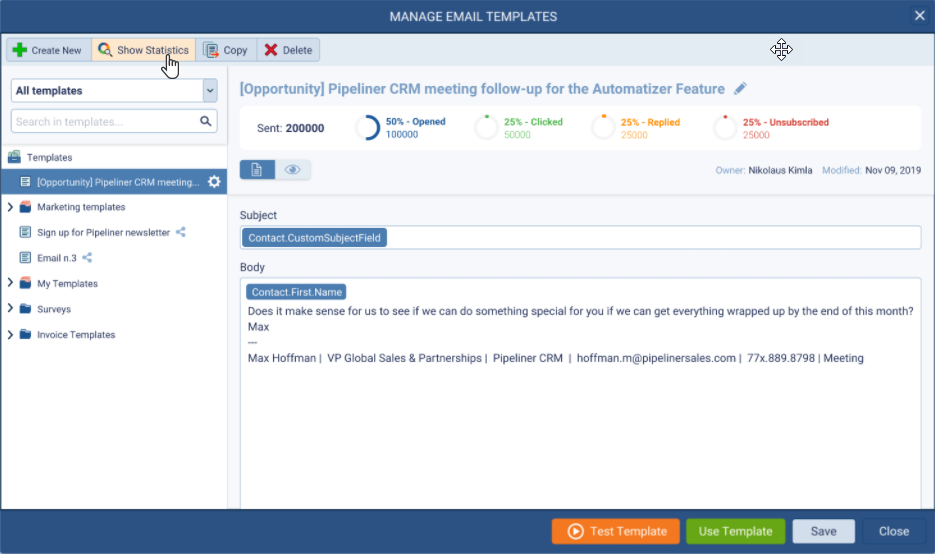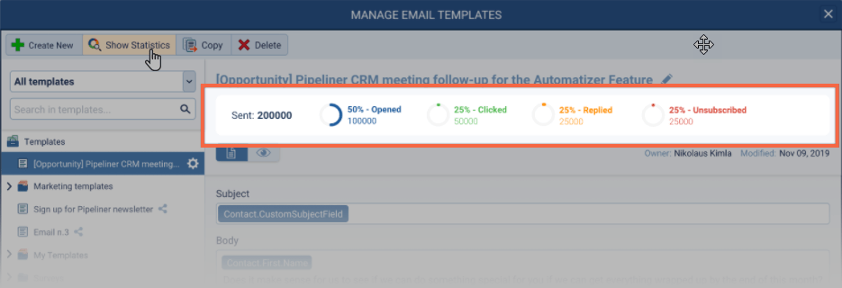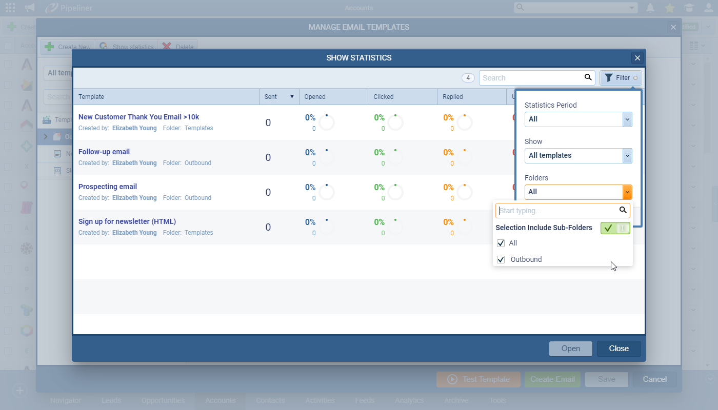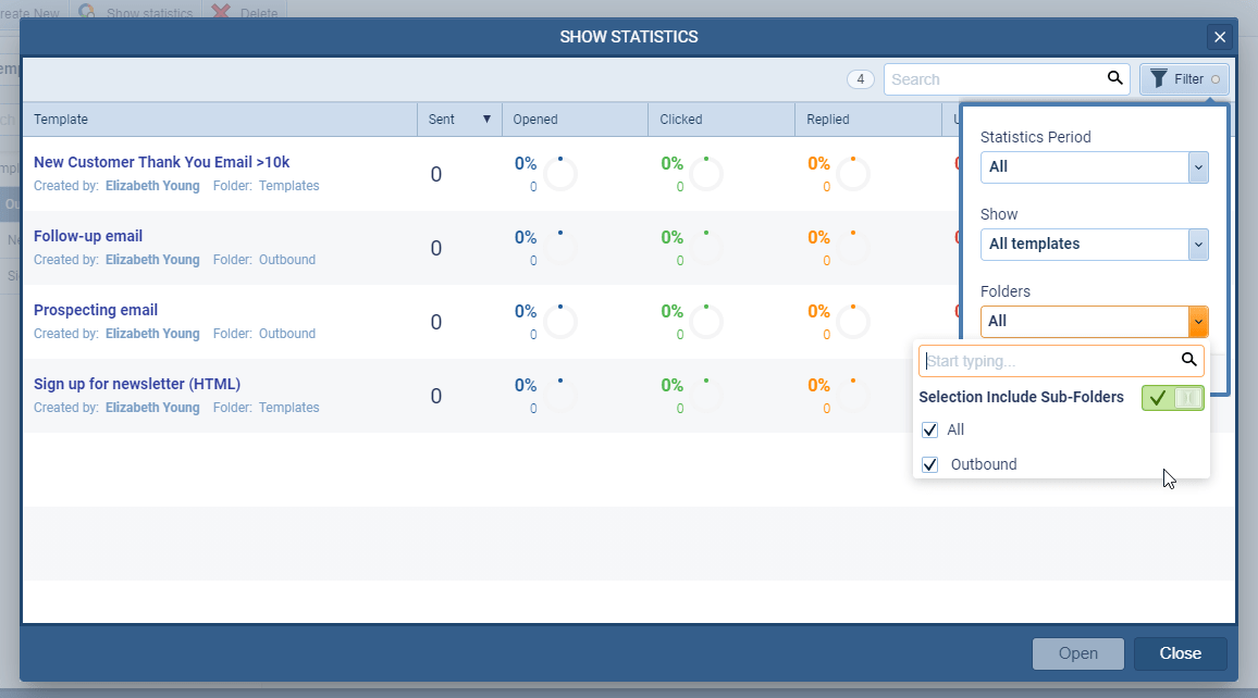 It is now also possible to compare these statistics for multiple templates — those within a specific folder or all or by type — text, HTML. If you save all your Outbound LeadLead Lead refers to a prospect or potential customer (who can be an individual or organization) that exhibits interest in your service or product; or any additional information about such entity. emails in a folder, you’ll be able to use the “Show Statistics” button, select your folder, and compare the statistics for each template so you can evaluate which one is performing best for you ⤵