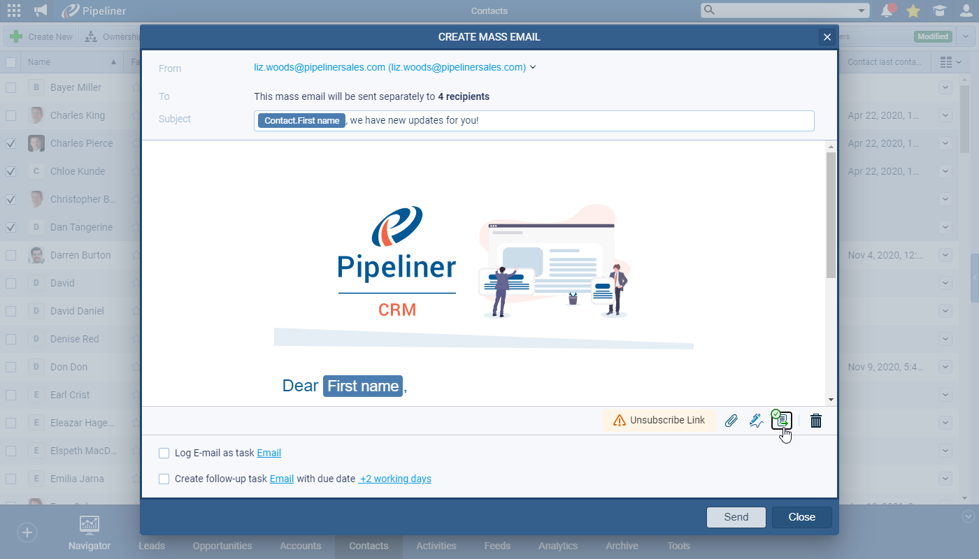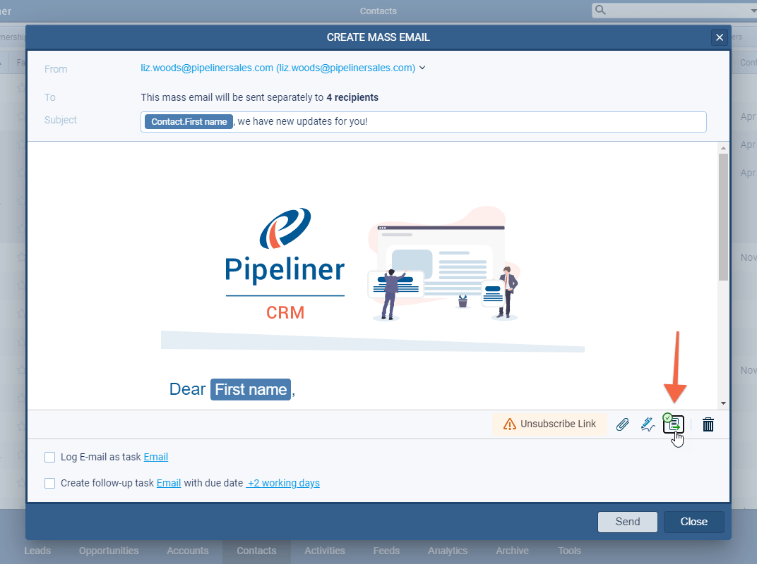 From this release, whenever your users use an email template when sending an Email or a Mass Email, the template is “linked” to the email itself and this allows tracking of the statistics for each template — the total number of times it has been sent, opened, links clicked, replied to or where the recipient unsubscribed ⤵