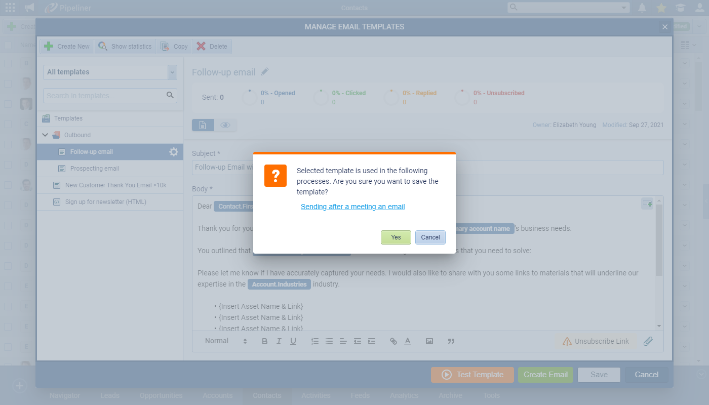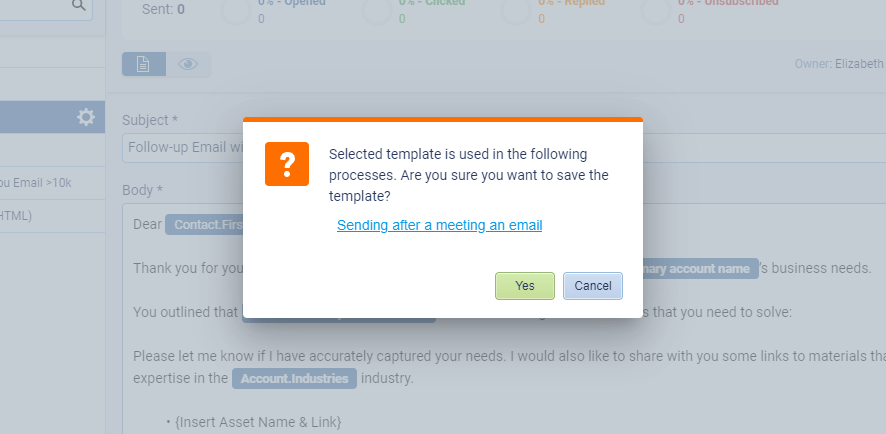 If you’re updating the content of a template and have used it, for example, in an Automatizer process, you’ll receive a warning that the content is being changed so you review the impact of your changes ⤵