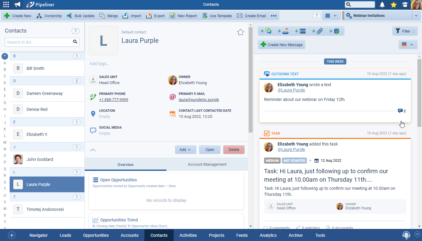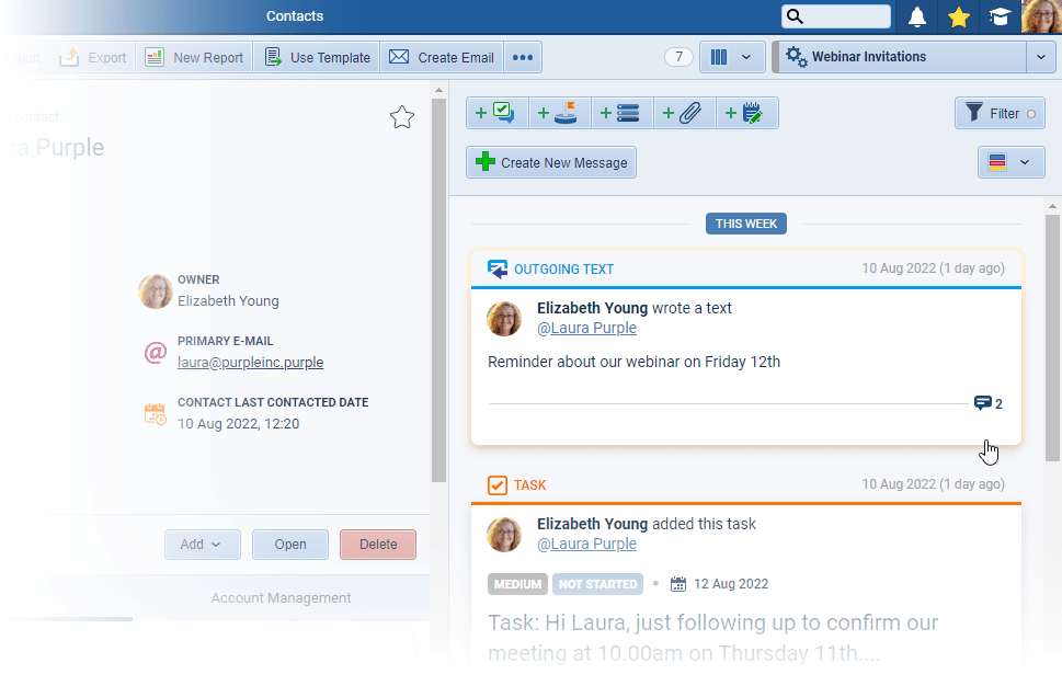 Using the Coevera Calling & Messaging feature, users can initiate a call directly from your Coevera cloud web application using a personal phone number and then log the call as a completed task. They can also send one-off or mass text messages directly from within the web app — using a purchased Coevera VOIP number — making keeping in touch with your company’s customers and prospects even more seamless and efficient. Text conversations will be stored in the Feeds in the app ⤵