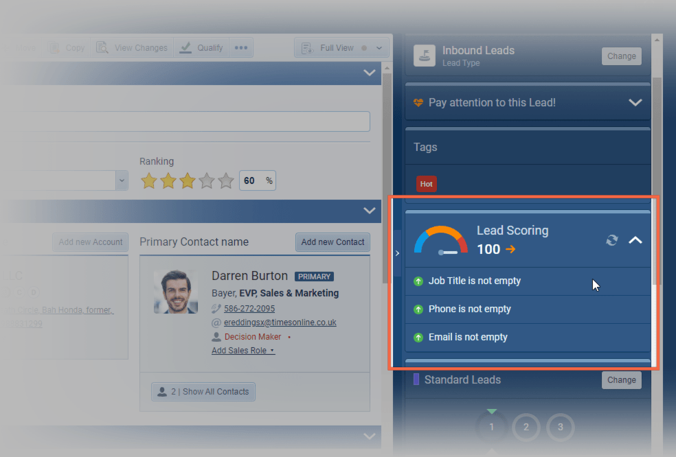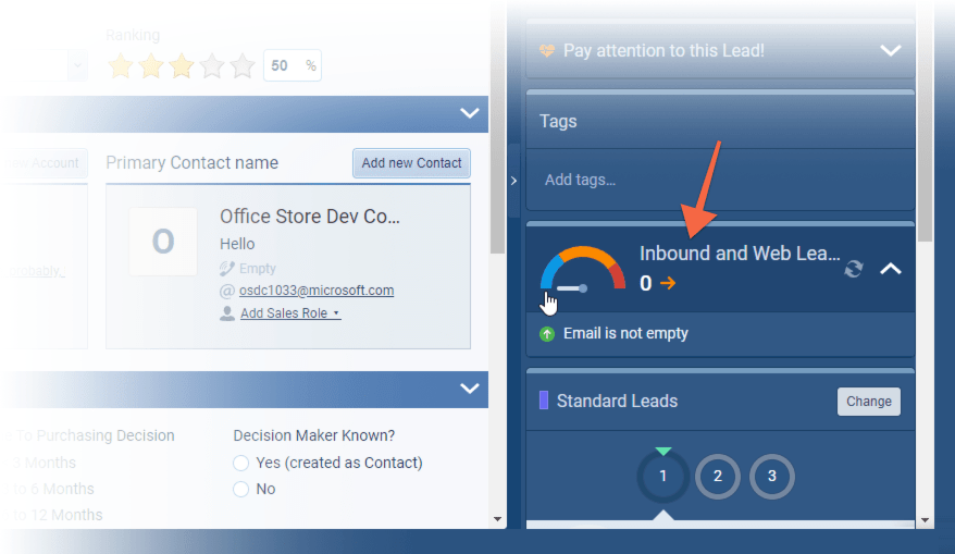 The Lead Scoring widget within a Lead shows both the Score and the gauge with a pointer towards the percentile for that Lead. ⤵