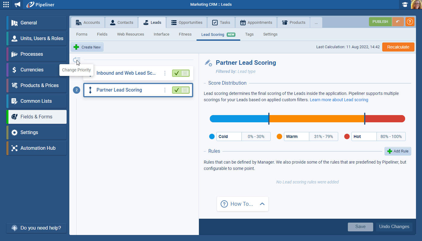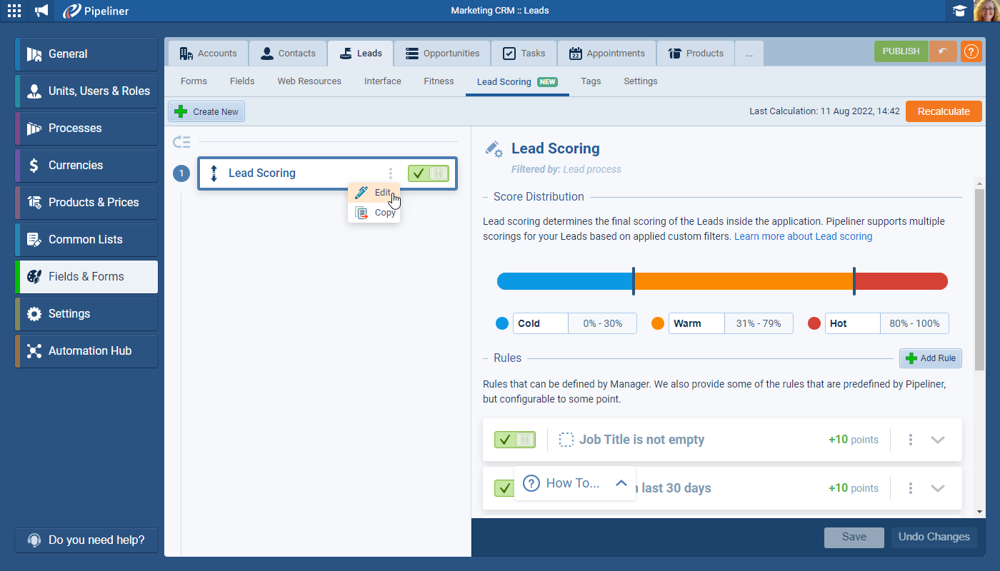 Coevera Admins set up Lead Scoring from the Admin Module from “Fields & Forms › Leads” and then the “Lead Scoring” tab. ⤵