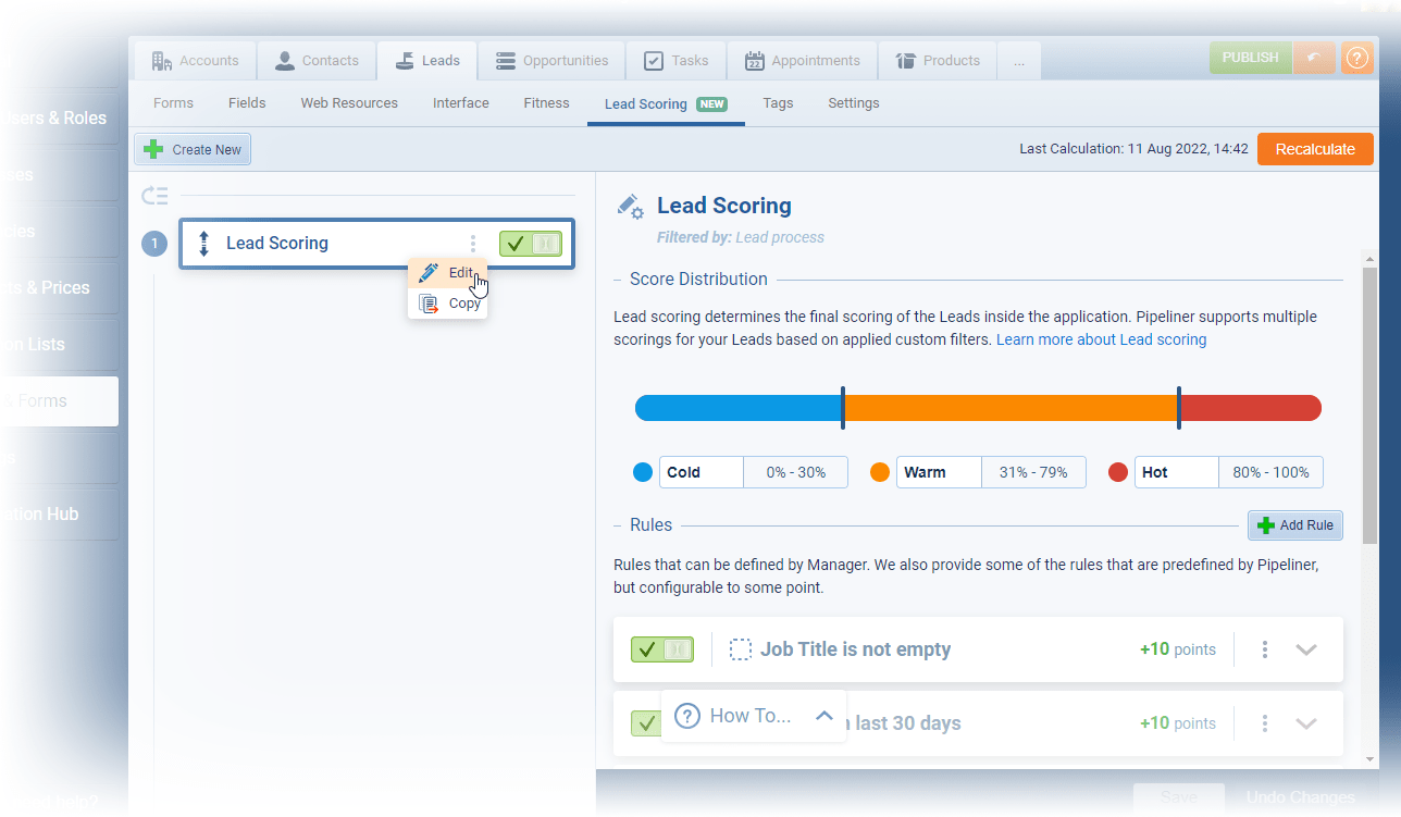 - The points score is calculated for every “Lead” with points assigned based on the Rules for the applied Lead Scoring.