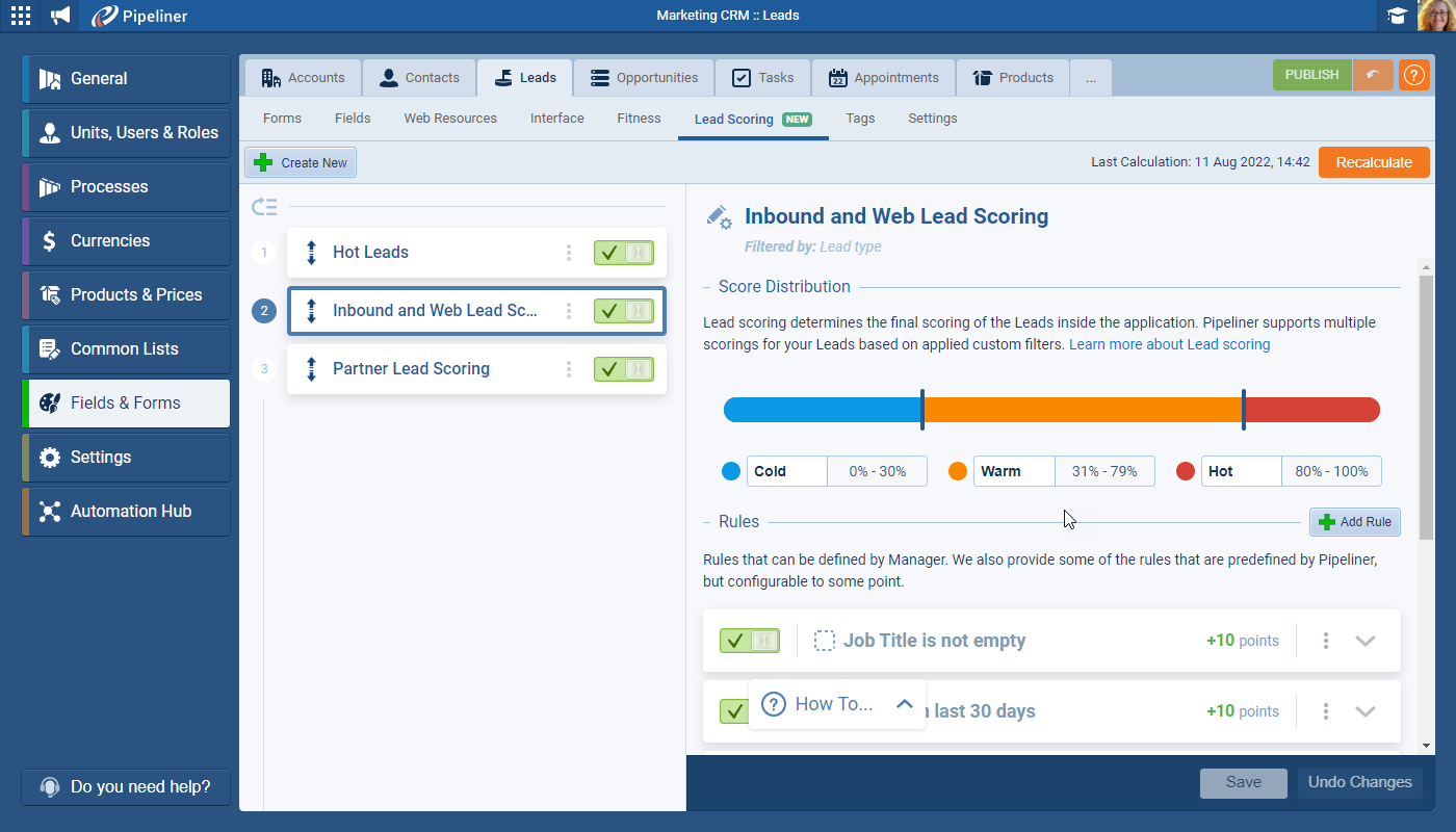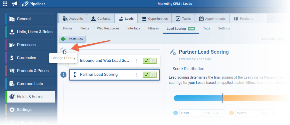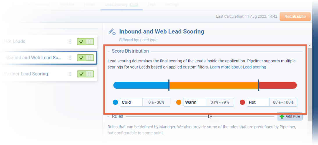 “Scoring Rules” are applied to each Lead and then the Leads are sorted and ranked with a percentage from 0-100% in order. Each Lead will then fall into a percentile bracket as defined in your “Score Distribution” for the applied Lead Scoring. These percentiles can be adjusted by dragging and dropping the separator and can also be renamed from the default “Cold”, “Warm” and “Hot”. ⤵