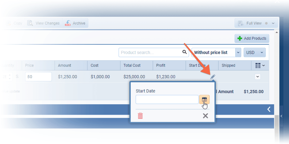 You can now update Product Line Item fields directly using inline editing in the Product Grid view rather than clicking on the Product name hyperlink each time. If you have lots of Products listed, you can use the new Expansion icon to expand the grid to show all Products rather than having to scroll and you can reorder Product Sections using drag and drop. ⤵