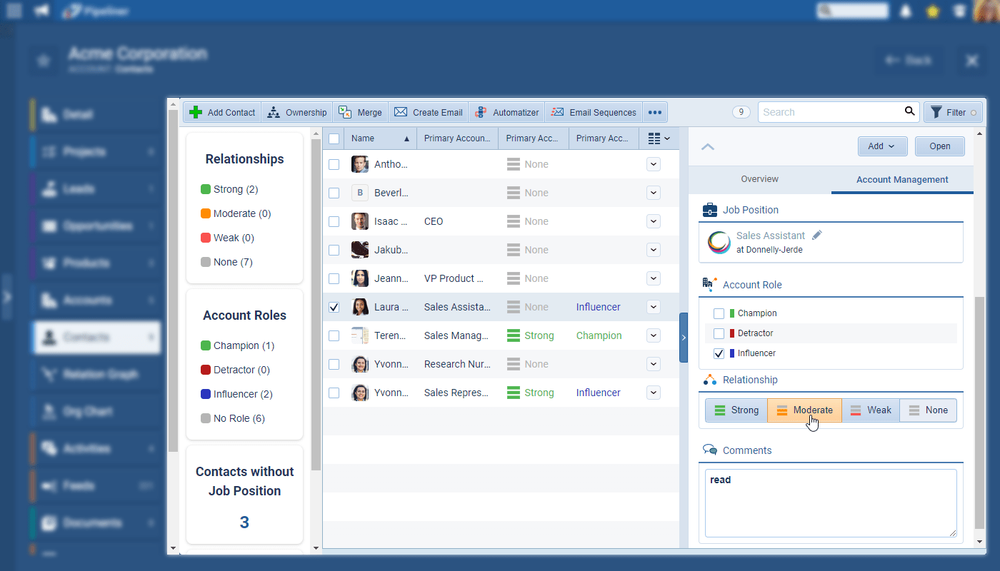 Building and maintaining relationships with the Contacts at your key prospects and customers is an important function for all of your users. To this end, we’ve made it even easier to see and understand the status of those relationships. Along with an overview panel that can be used to filter Contacts based on “Relationship” or “Account Role“, inline editing for Account Roles and Account Relationships is also supported in the “Contact List View” as well as in the sidebar. Users can also access in Automatizer processes and update using “Bulk Update“. ⤵