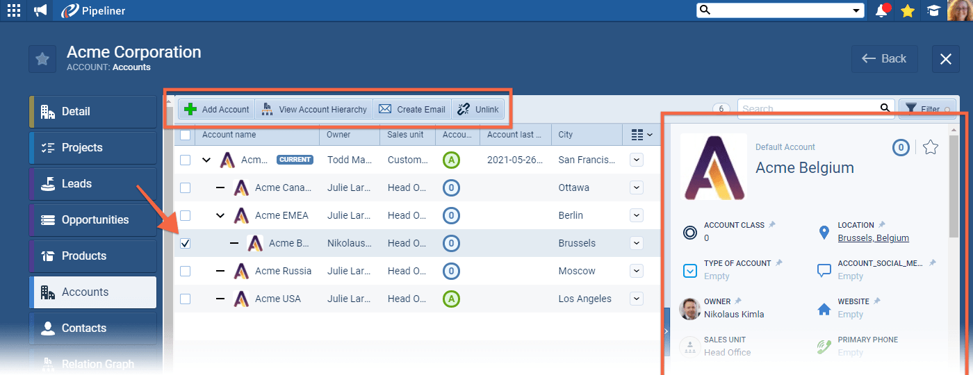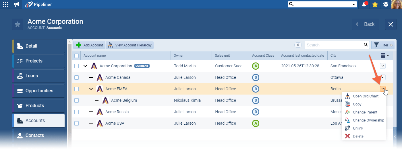 We’ve updated the “List View” of related Accounts from the Accounts tab within your selected record. This view now also shows you the hierarchy of the Accounts and you can also manage and update the relationship from the dropdown on the right hand side. Your selected Account is always labelled as “Current” so you know where it sits within the organizational structure ⤵