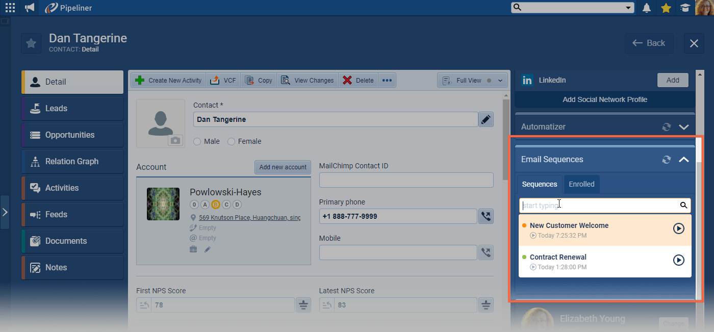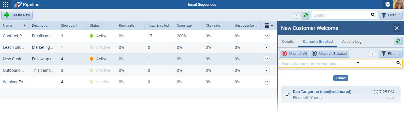 - “Details” › see overview stats for the sequence as well as manually “Enroll” records to the sequence.