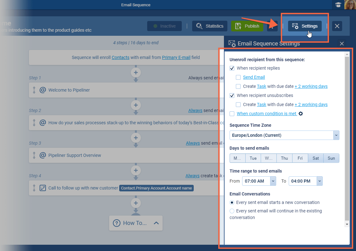 For each sequence, a timezone, time range and the days on which to send the emails can be selected.