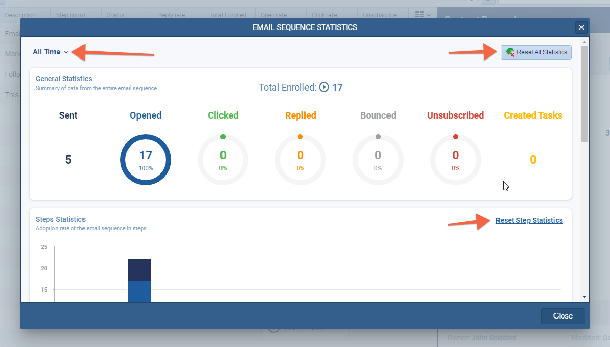 Email sequence statistics display the performance of the sequence and users can select options for date ranges or view by step or timeline and can also reset statistics ⤵