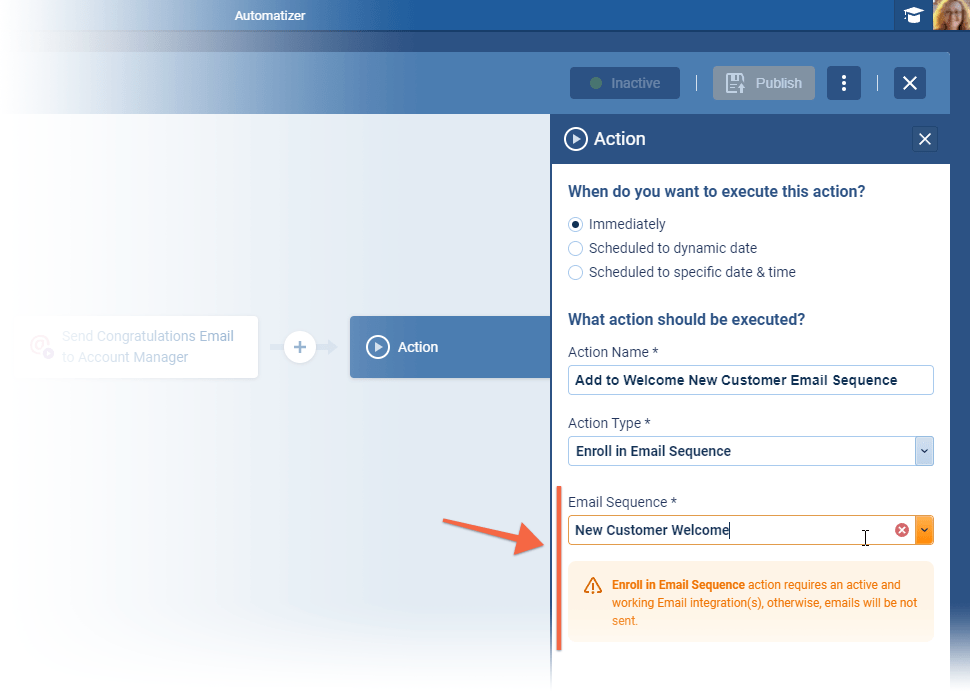 Enrolling records into an Email Sequence is a new Action from Automatizer. Note that the recipients for the sequence must be the same as the Automatizer trigger record (e.g. both must be Contacts or both must be Leads) ⤵