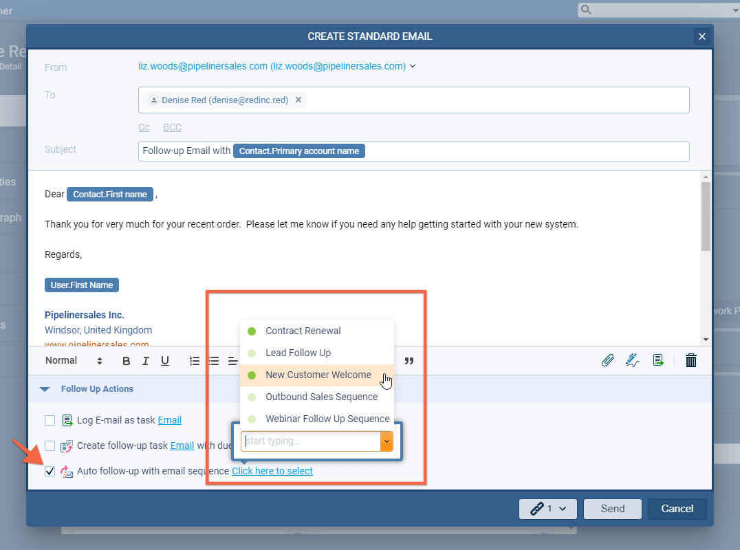 In the email composer there is a new Action “Auto Follow-up with Email sequence”. When the email is sent, the recipient is automatically enrolled to the selected “Email Sequence” ⤵