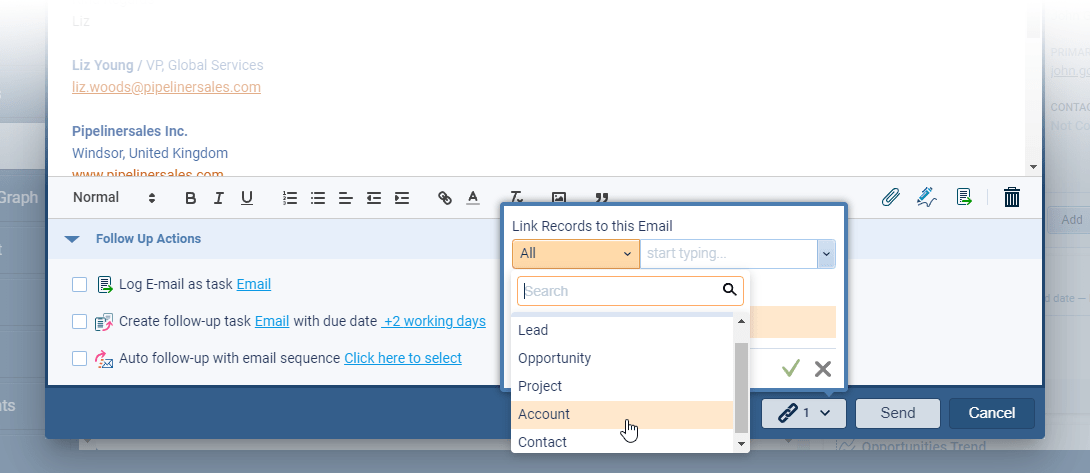 When sending an email to a Contact, you can now also choose to link to an Account — or another Contact record (as well as LeadLead Lead refers to a prospect or potential customer (who can be an individual or organization) that exhibits interest in your service or product; or any additional information about such entity., Opportunity or Project). We’ve added this option for those customers who want a specific email to a Contact to also update the Account’s “Last Contacted Date” ⤵