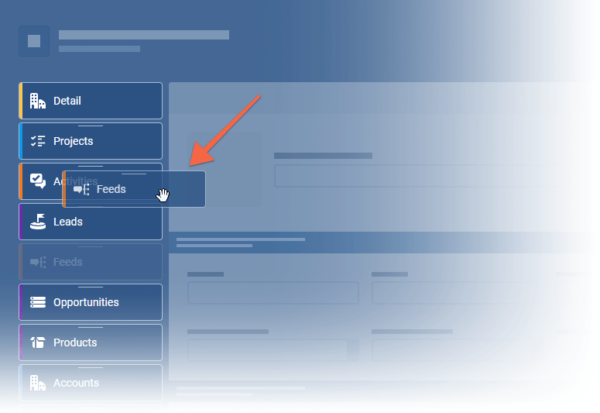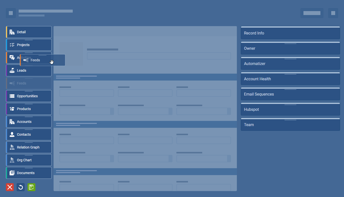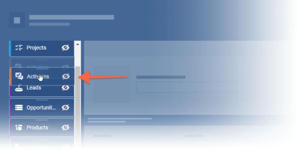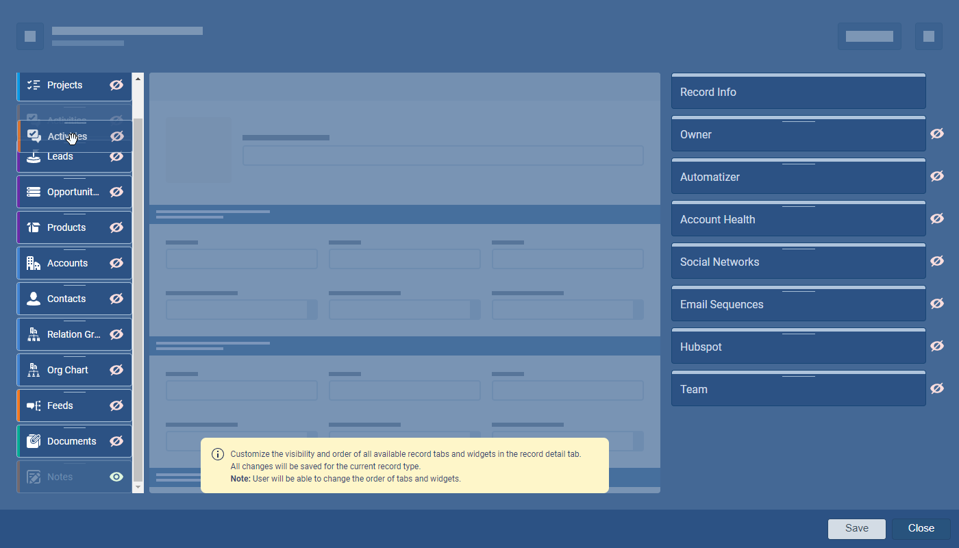 Admins can select which “Tabs” should be available and which Widgets should be displayed in the sidebar. From the “Admin Module › Fields and Forms“, Admins select the “Interface” tab and then “Account Detail › Edit Detail“. Remove a Tab or Widget from view by clicking on the “eye” icon. You can also set a default sort order — Drag & Drop a Tab or Widget to the desired position. “Save” and “Publish” any changes ⤵