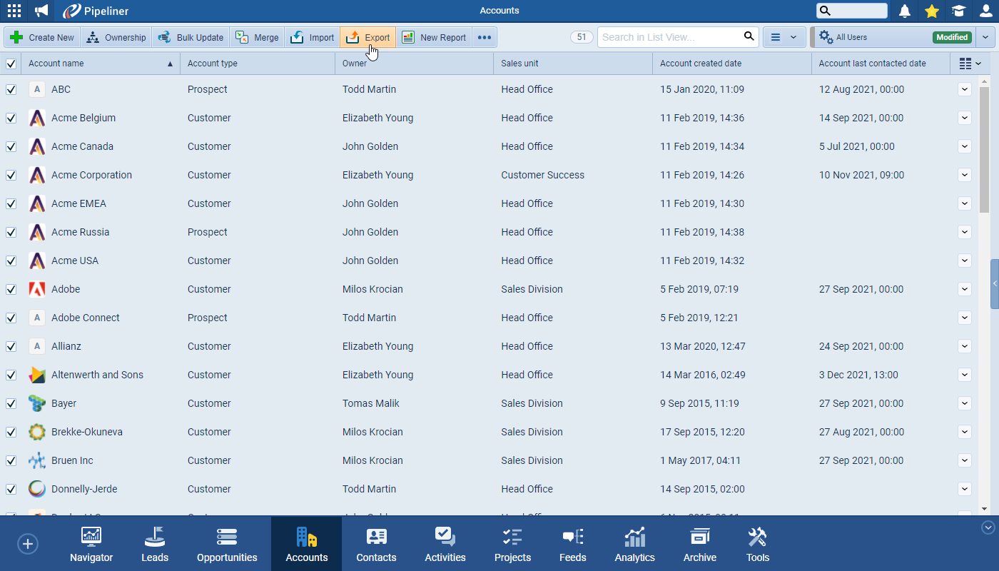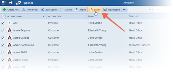 Previously, when exporting from the main menu – e.g. Accounts, Contacts, Opportunities etc – all fields on the Form for that type of record were included in the export. Now, when exporting from the List View, only the fields included as columns in the view will be exported ⤵