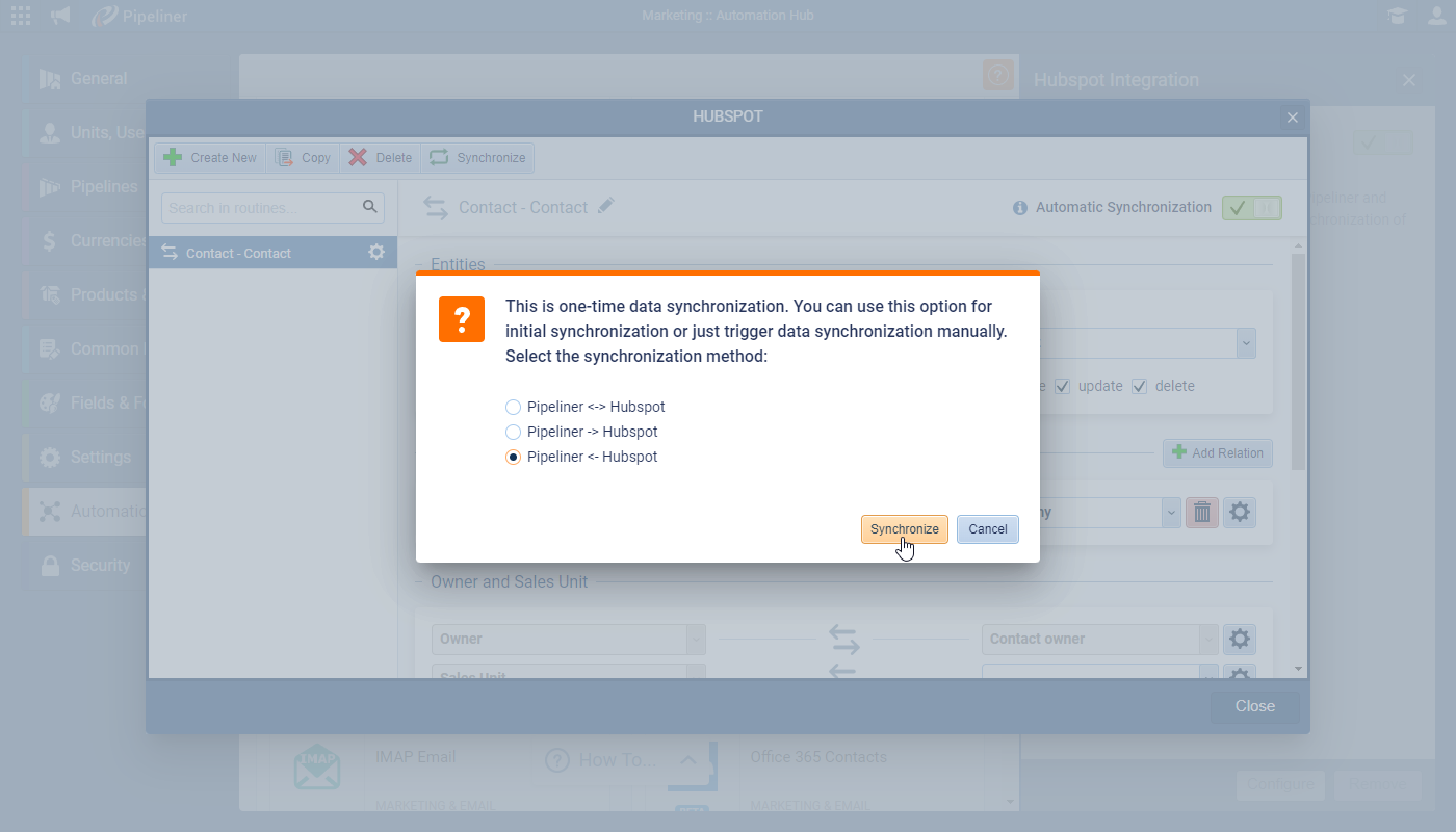We’ve already enhanced our new native Hubspot integration!! First we’ve added an additional synchronization option to allow you to sync all existing records from Hubspot without needing to update them. Once you’ve saved your configuration, click on the “Synchronize” button to trigger this initial sync (or to manually sync dataData Data is a set of quantitative and qualitative facts that can be used as reference or inputs for computations, analyses, descriptions, predictions, reasoning and planning. on demand) ⤵