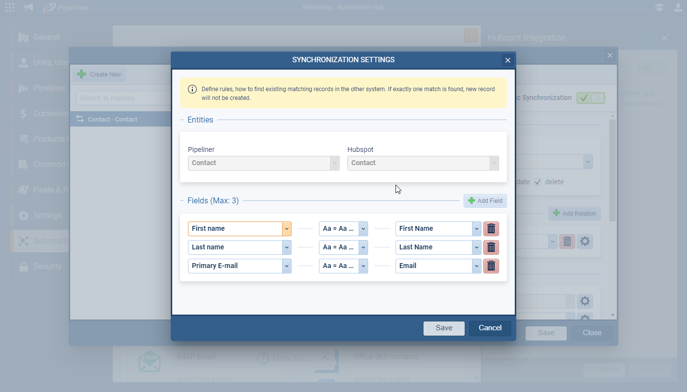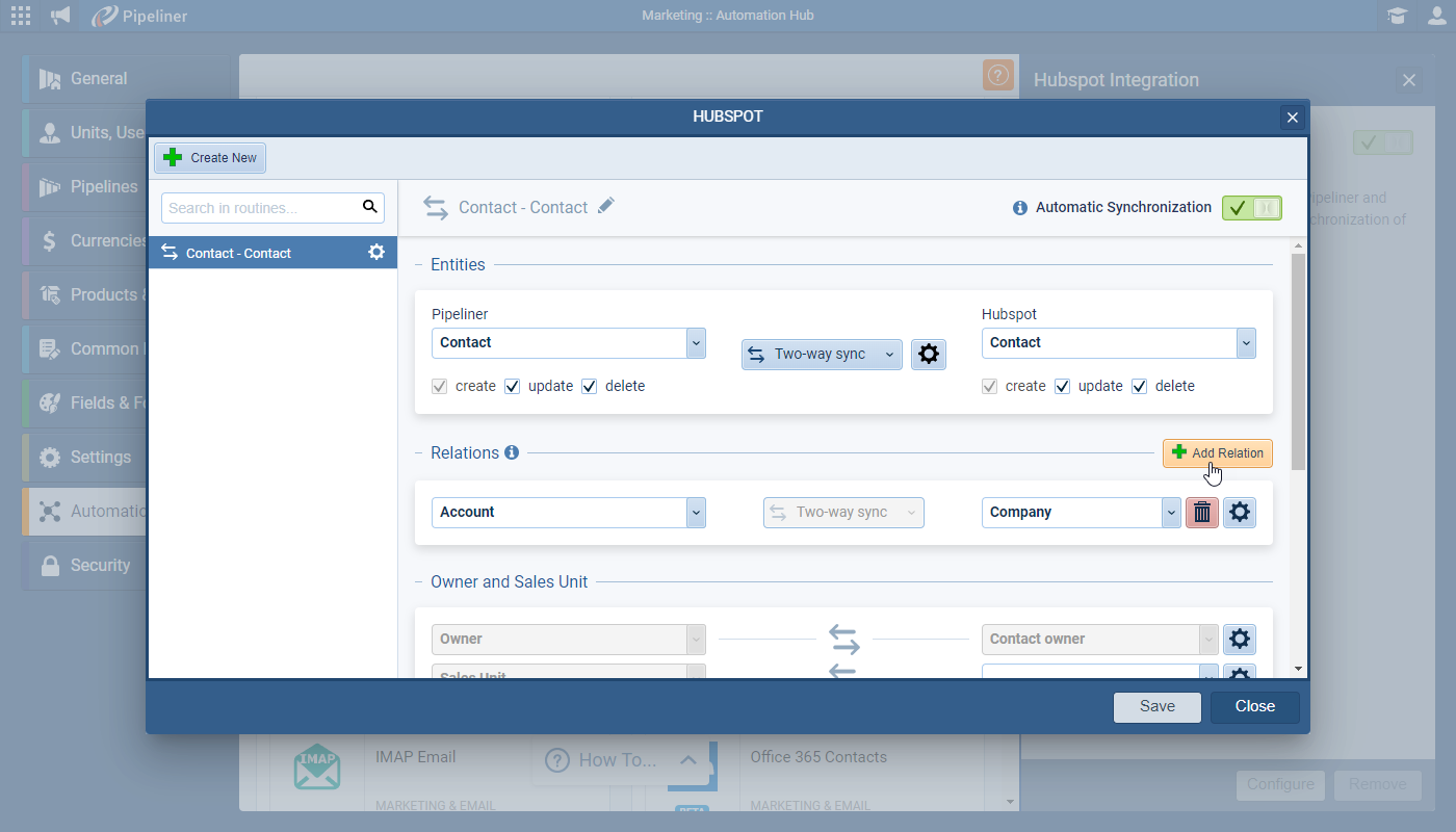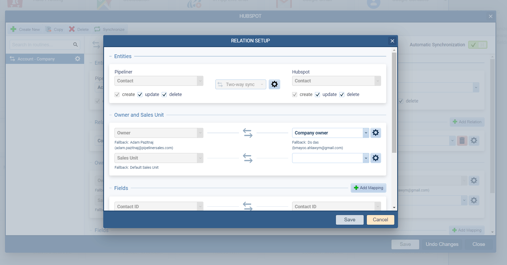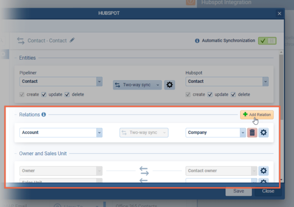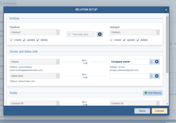 Relationships are now also supported. When syncing data via Hubspot, Coevera can automatically link related records — e.g. when creating a Contact from Hubspot, “Primary Account” can be linked automatically. Every relationship can have its own setup and you can select what fields in the related entity should be synchronized ⤵