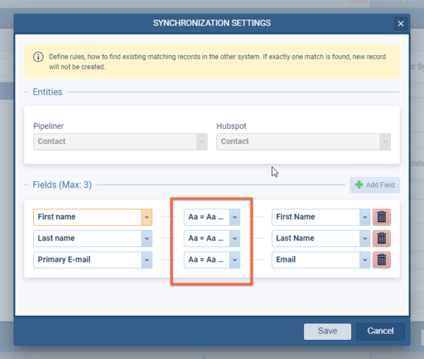 Matching records to avoid duplicates. You can match records on up to 3 fields for higher precision and can select if the fields should be matched by an exact or partial match (“equals” vs “contains”) ⤵