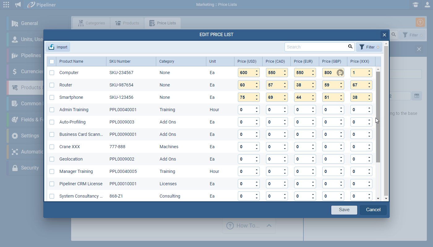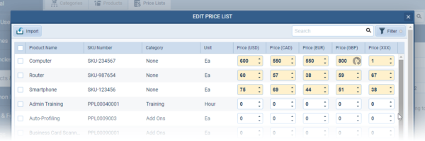 It is now possible to update an existing Price List with new prices for some, or all, Products. Open your Price List and click on “Import”, choose your Settings and then map your fields matching to existing products on SKU or name. Only the Products included in your Price List update will have their pricing changed ⤵