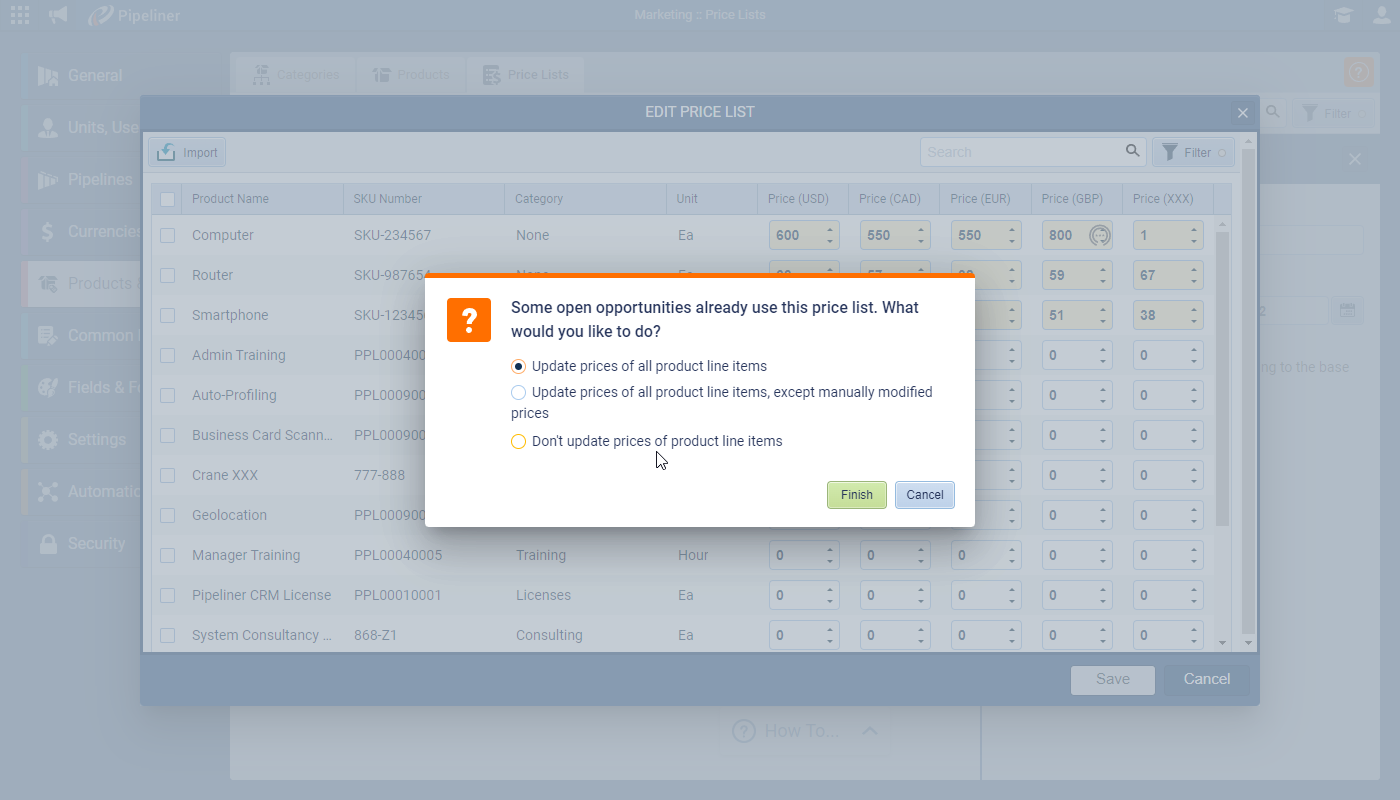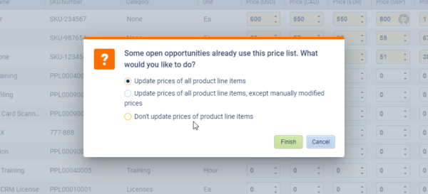 If existing Open Opportunities are using the current pricing prior to the update, you’ll be prompted whether you want to update them with the new pricing or leave them “as is” ⤵