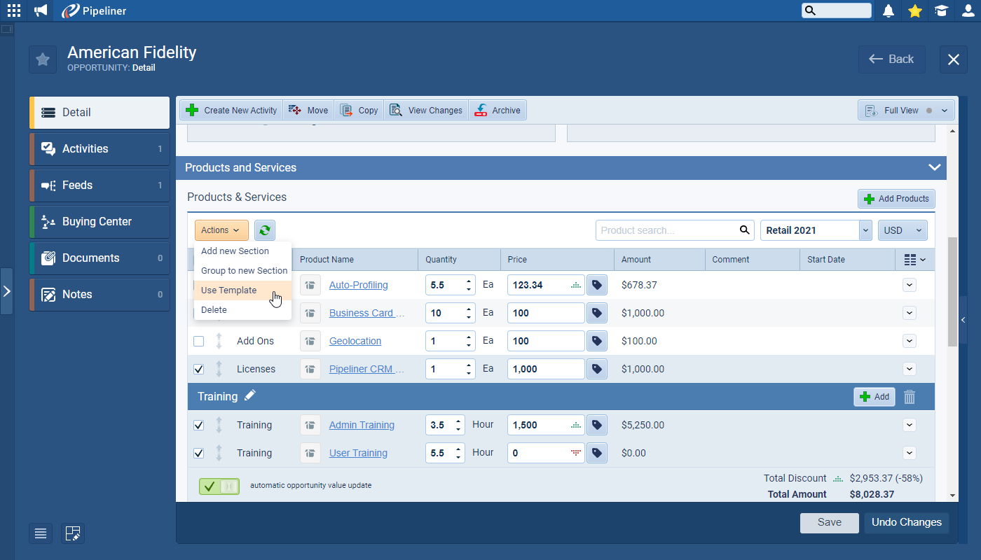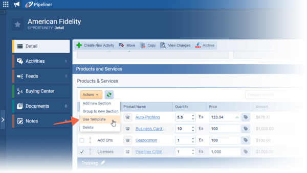 Your Opportunity might have several Products linked to it but when you come to create a quote, for example, you may only want specific Products to be included in your proposal. You can now select specific Products from the Opportunity and select the Use TemplateTemplate Template is a generic file with a framework showing the standard sections or features of a specific kind of document, used to create a new document of the same type faster and easier. option from the “Actions” dropdown and only the selected Products will be included ⤵