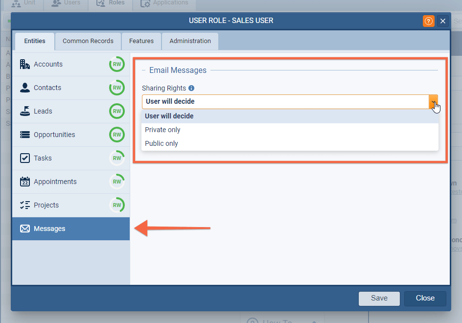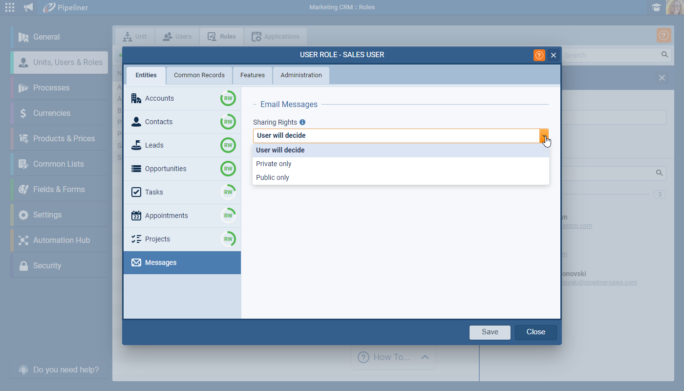 - Private only › the content of all emails sent to and received by users based on this role will be hidden. Users cannot change the default sharing settings of emails. Sharing can be manually changed on individual emails.