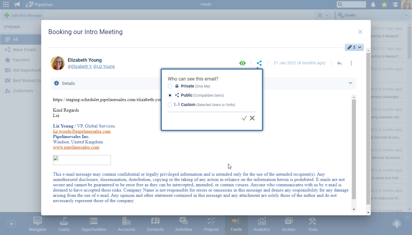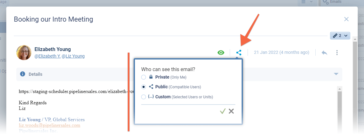 - Private › visible only to themselves and other users who were cc’d on the email