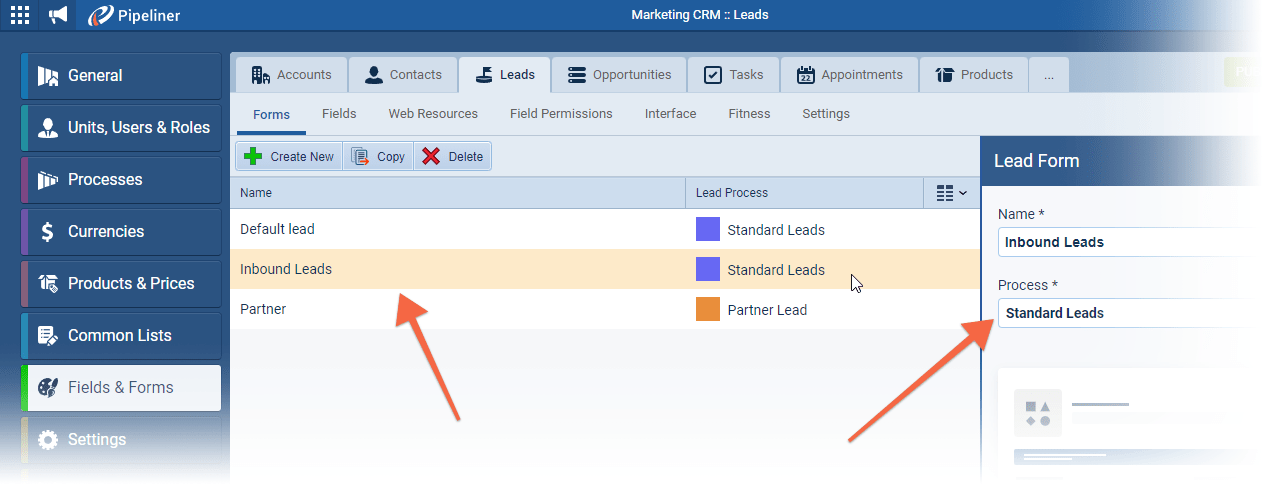 Each Form will be linked to a Lead Process — either the default process or a custom Lead Process that has been created. Note that a single Lead Process may have multiple Lead Forms associated with it — each with a different combination of fields to capture specific information. New forms can be created or existing forms copied and amended ⤵