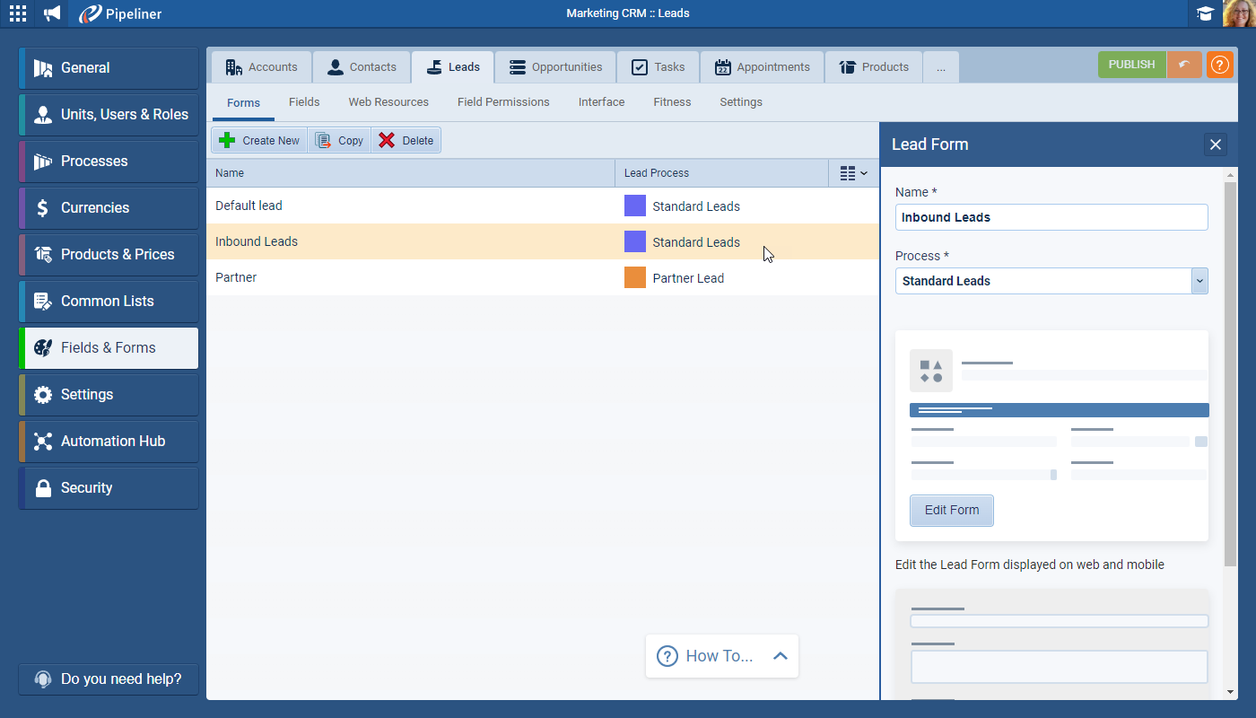 Once a Lead Form has been created, add and remove Fields by editing the Form ⤵