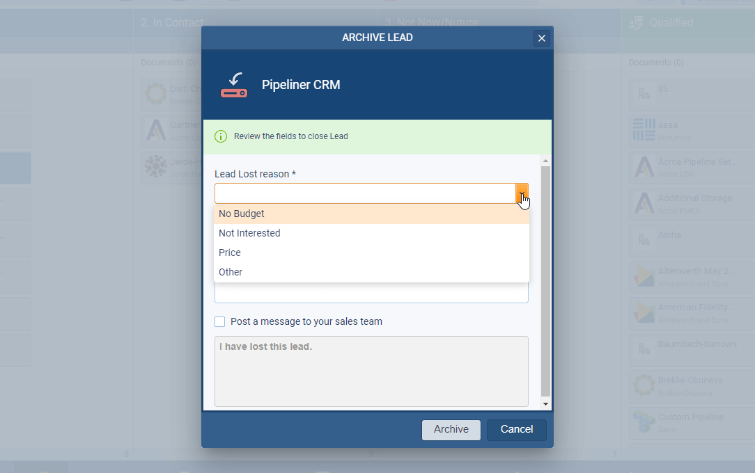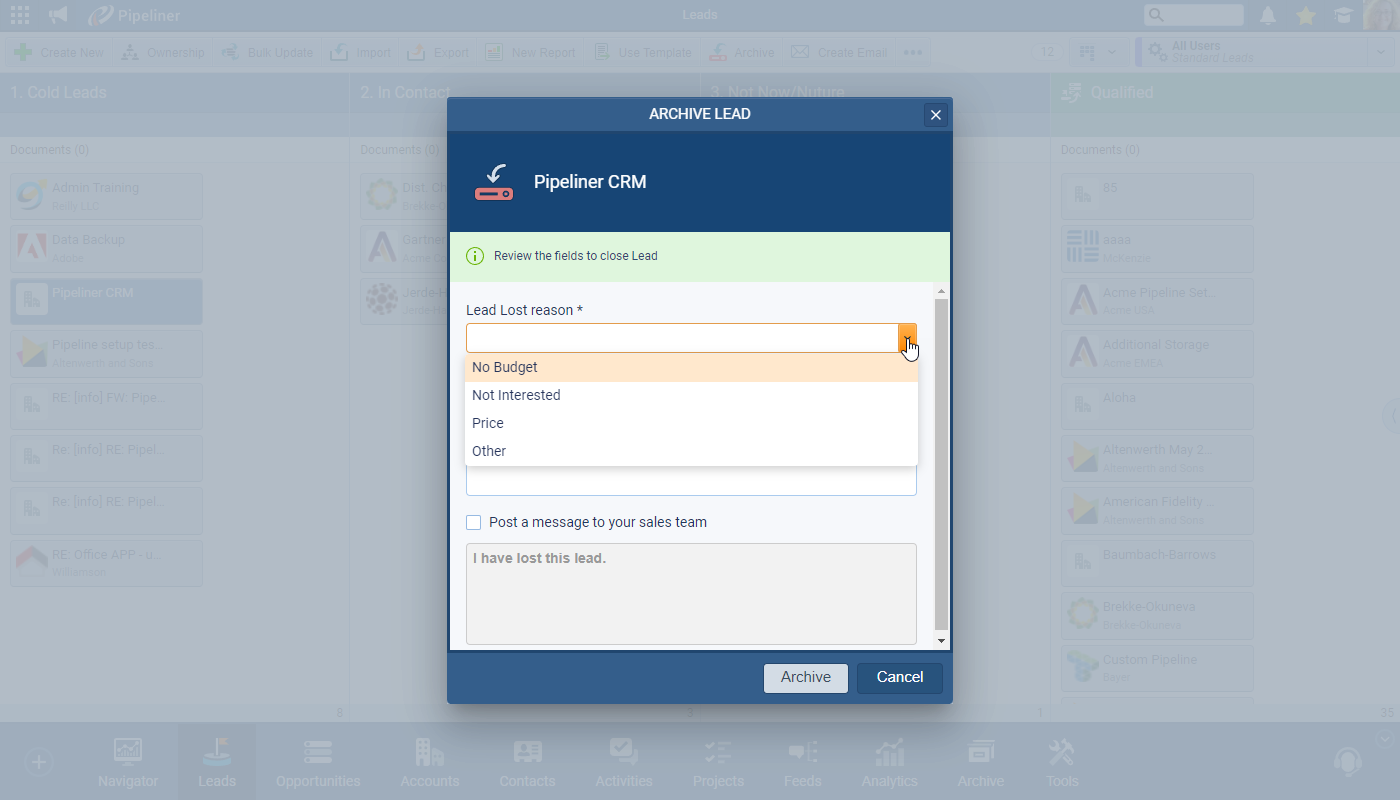 If enabled, users will be prompted to complete the details when archiving any Lead as “Lost” ⤵