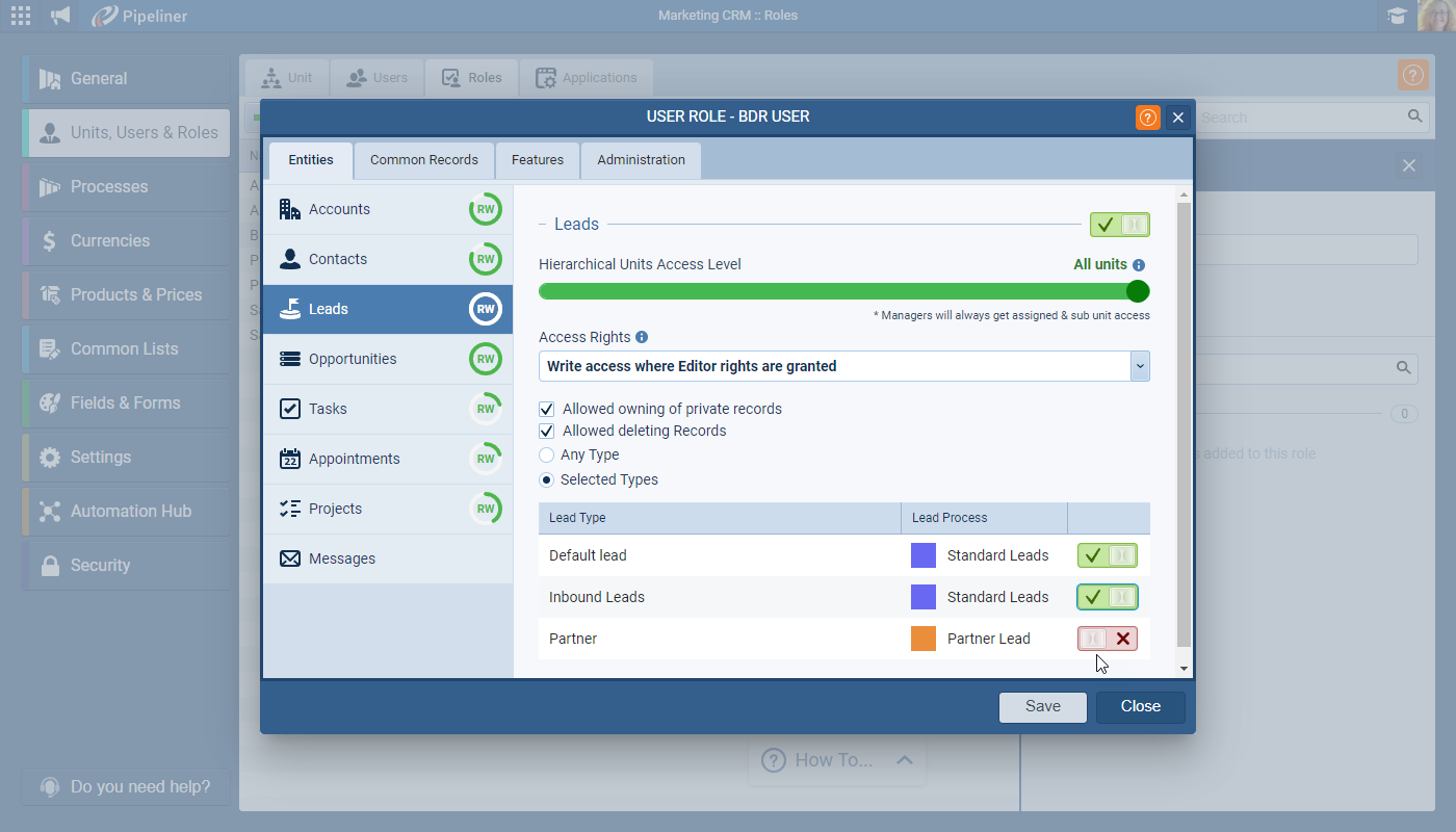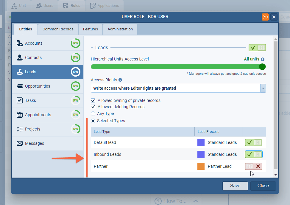 Access to different Lead “Form Types” (and their associated Processes) can be managed at the “UserUser User means a person who uses or consumes a product or a service, usually a digital device or an online service. Role” level ⤵