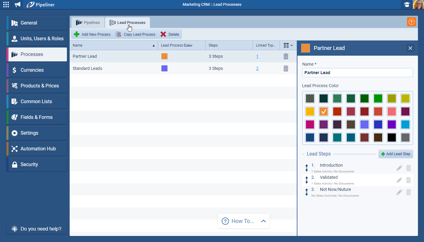 Our new Lead Management functionality allows Coevera Admins to create an unlimited number of lead Processes, each with different steps and associated Activities Checklist made up of text prompts, field prompts or activity prompts, each of which can be made “required” — just as when creating a pipeline for an “Opportunity Process” ⤵