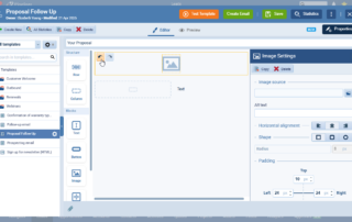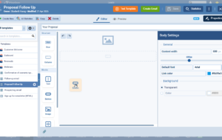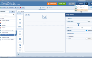 On the right hand side of the header are buttons allowing users to Test template, Create Email (Use template), Save or access Statistics (this opens a sidebar with the selected template’s statistics)