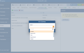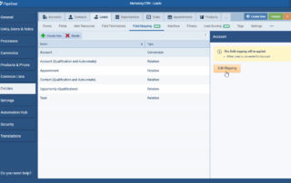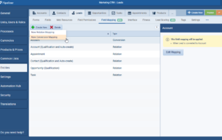 Once the user has selected which entity to convert to – for example, LeadLead Lead refers to a prospect or potential customer (who can be an individual or organization) that exhibits interest in your service or product; or any additional information about such entity. to AccountAccount Account refers to a record of primary and background information about an individual or corporate customer, including contact data, preferred services, and transactions with your company. – they will need to "Edit Mapping" to select which field on the originating entity to map to the newly created entity