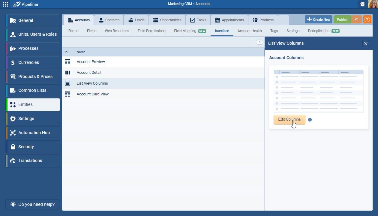In Admin › Entities, for every entity where Interface settings are available, there is a new option “List View Columns”