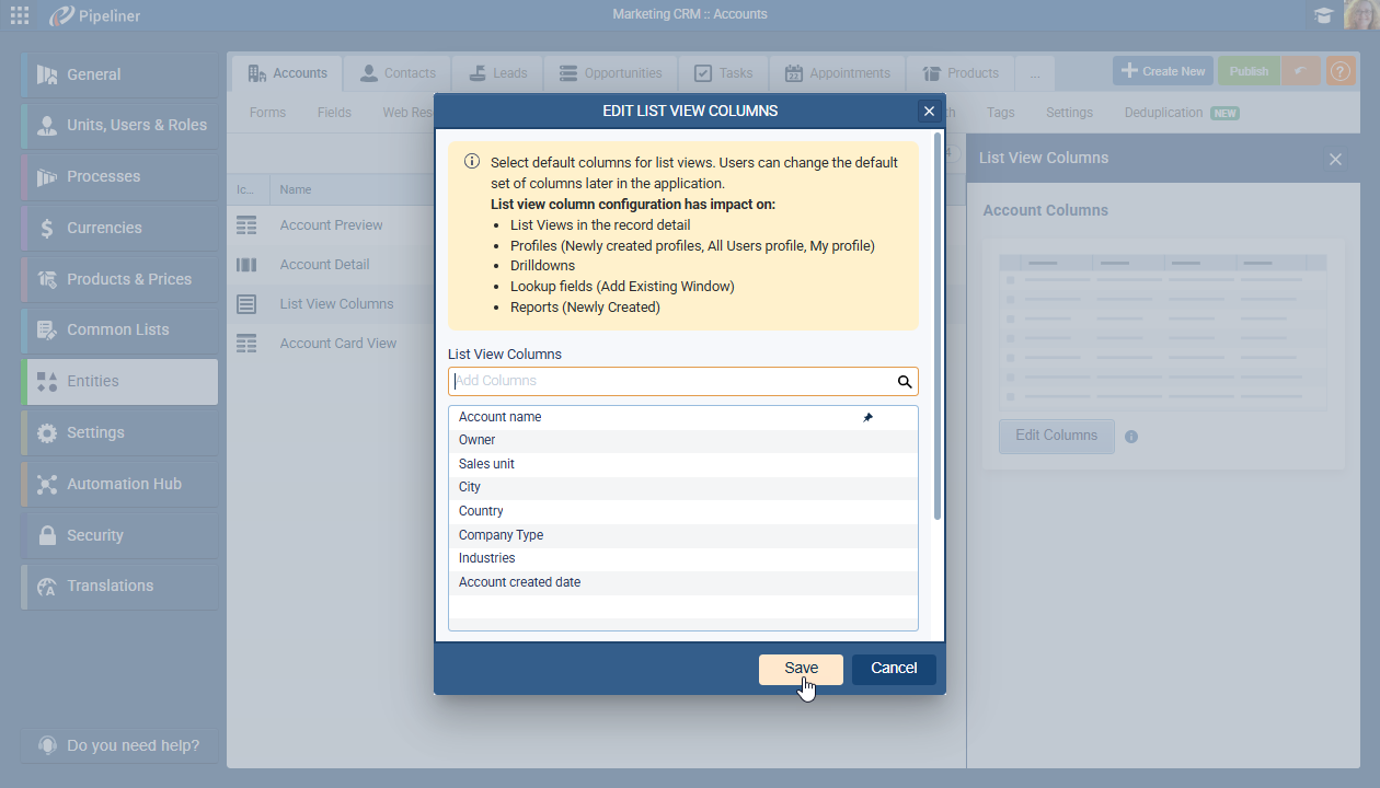 Clicking on Edit Columns allows the Admins to define the default list view columns for all users