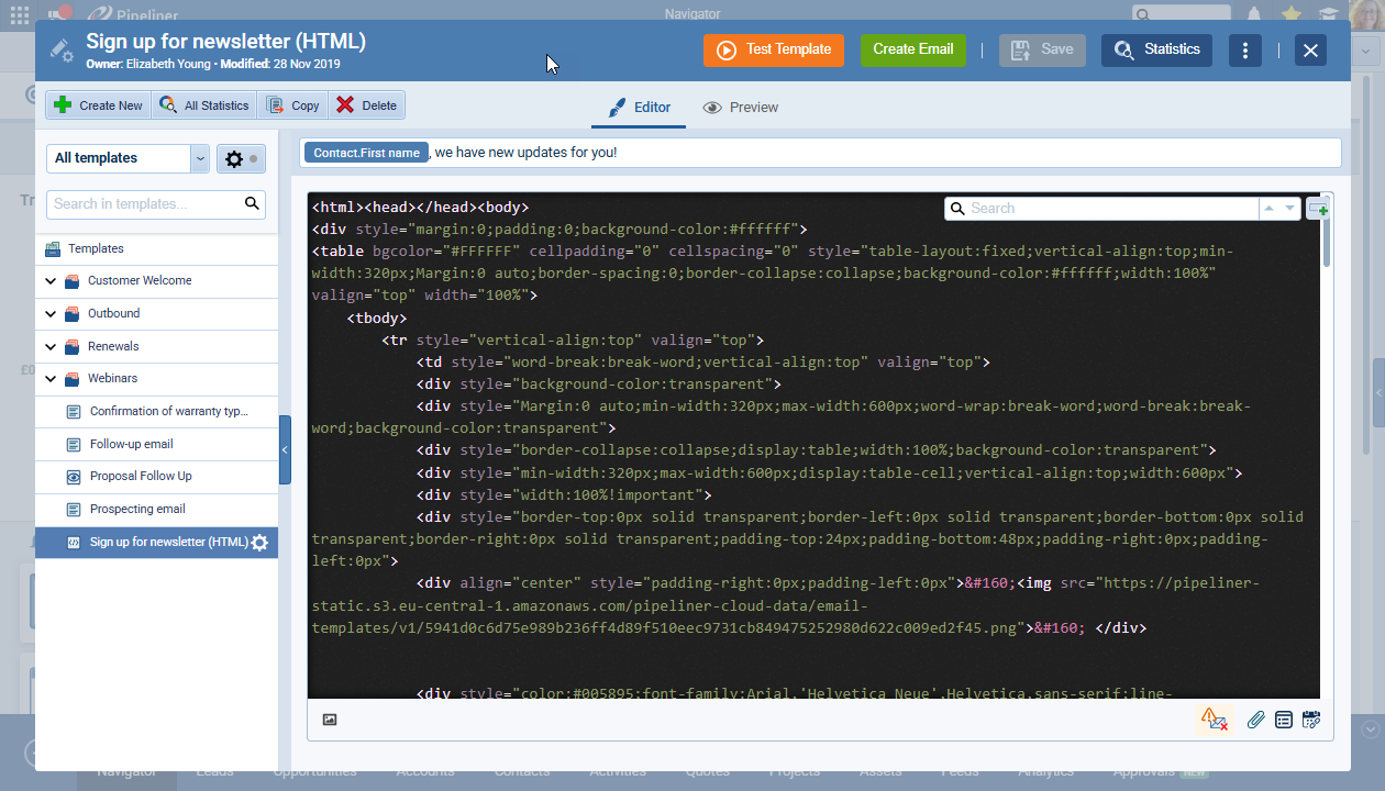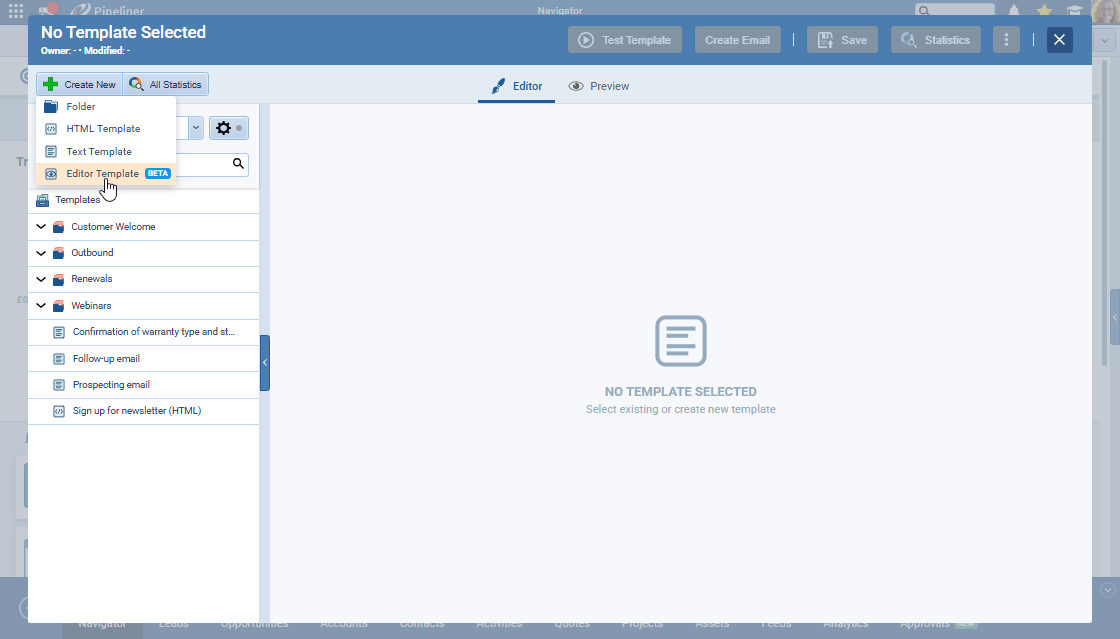 Below the header is the main toolbar with options to create new templates, access All Statistics, copy an existing template or delete the selected template and also to switch between the Editor & Preview modes. In Preview mode, users can select different views of the template: desktop, mobile or users can select a record to view the template with personalization