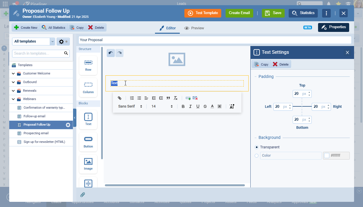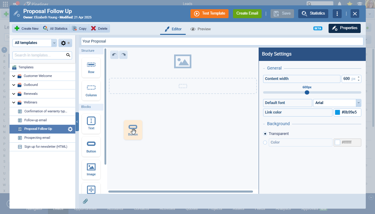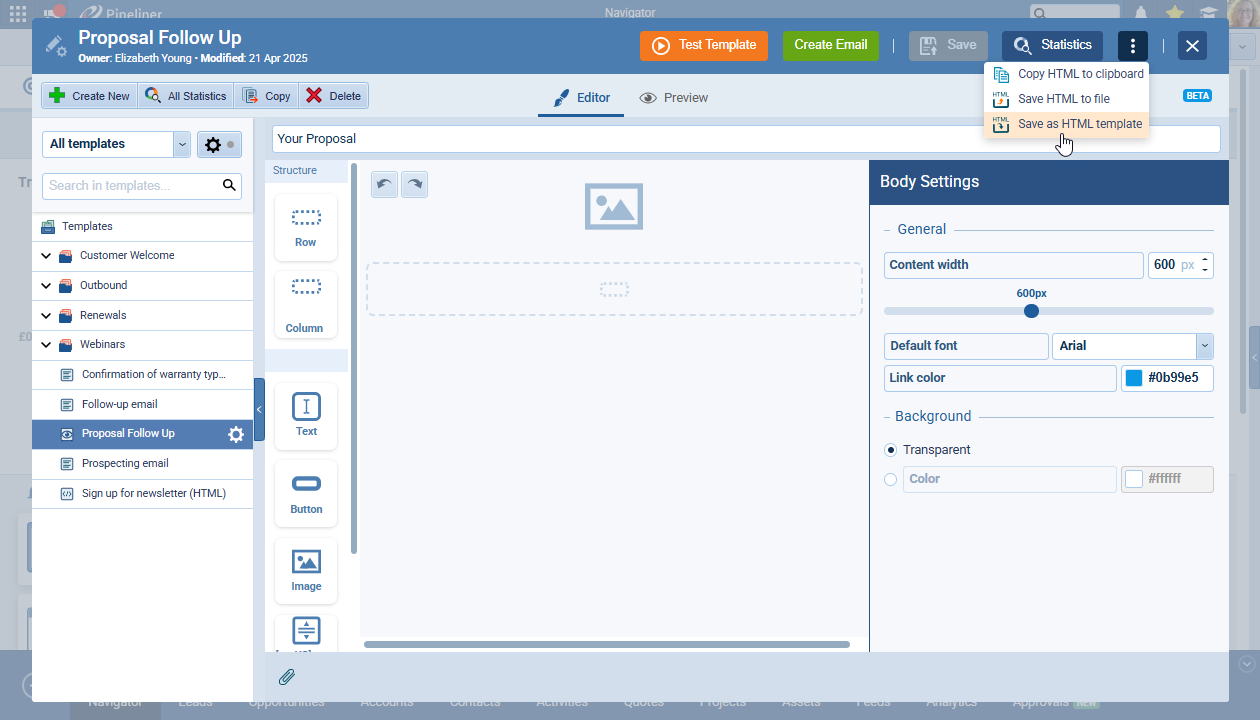 Click on “Save” to save the template, “Test Template” to send a test version to a specified email address and “Create Email” to use the template to send an email.