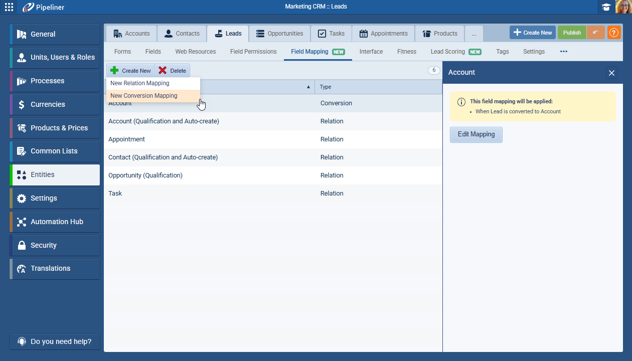 We've enhanced the Field Mapping feature introduced in version 5.13 by adding an option to map dataData Data is a set of quantitative and qualitative facts that can be used as reference or inputs for computations, analyses, descriptions, predictions, reasoning and planning. from fields on an existing entity to a new entity using the option to create a "New Conversion Mapping" as well as the existing "New Relation Mapping" option.