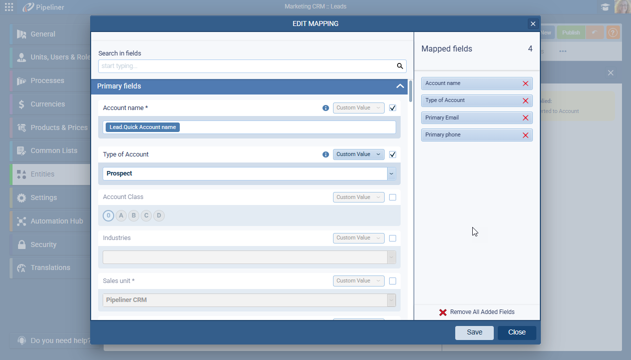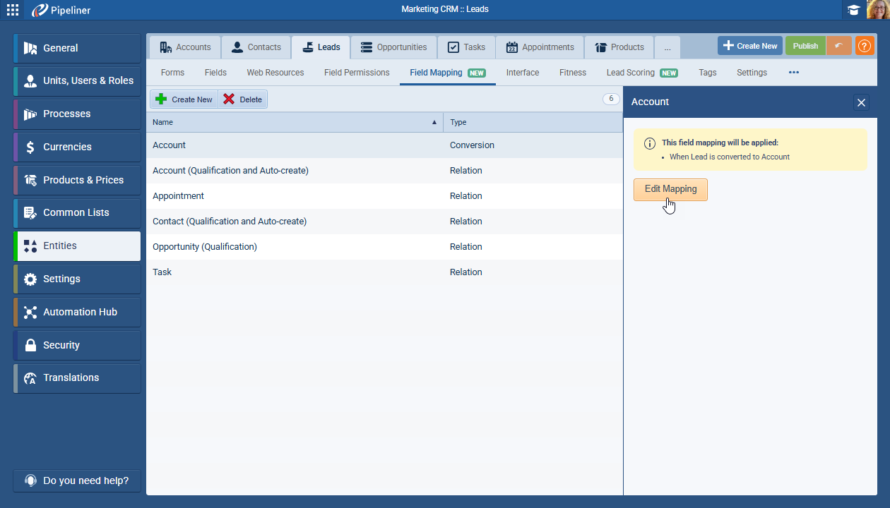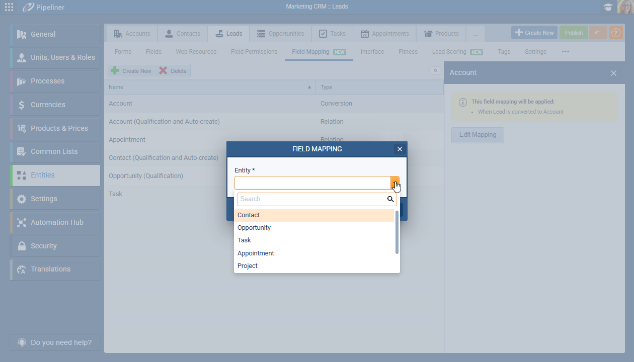 Once the user has selected which entity to convert to – for example, LeadLead Lead refers to a prospect or potential customer (who can be an individual or organization) that exhibits interest in your service or product; or any additional information about such entity. to AccountAccount Account refers to a record of primary and background information about an individual or corporate customer, including contact data, preferred services, and transactions with your company. – they will need to "Edit Mapping" to select which field on the originating entity to map to the newly created entity