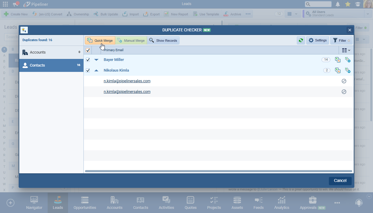 Merging a lot of records is a heavy backend operation, therefore we allow only one such operation for all users and entities within the current space (but manual merge is available). If another user opens a duplicate checker, he will also see there is a merging operation in progress
