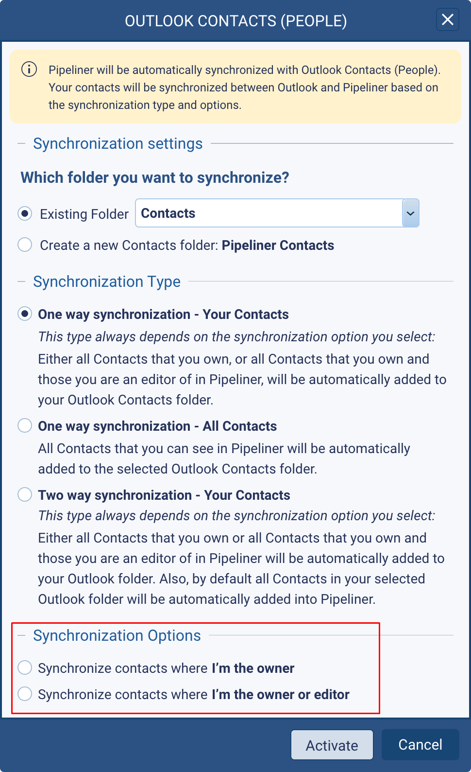 The synchronization option is not visible when “One-way synchronization – All contacts” is selected