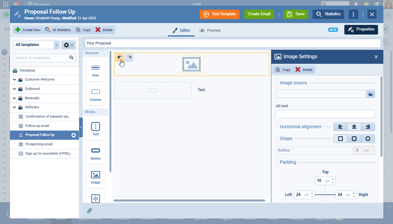 On the right hand side of the header are buttons allowing users to Test template, Create Email (Use template), Save or access Statistics (this opens a sidebar with the selected template’s statistics)