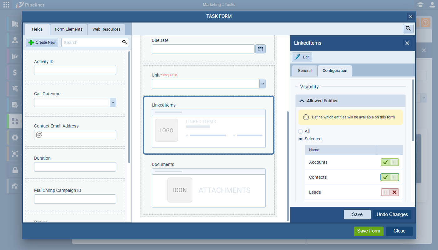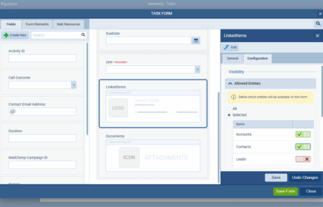 - Selected: The admin can use a checklist to specify which entities (e.g., Accounts, Contacts, Leads, Opportunities) are available for linking on this specific form.