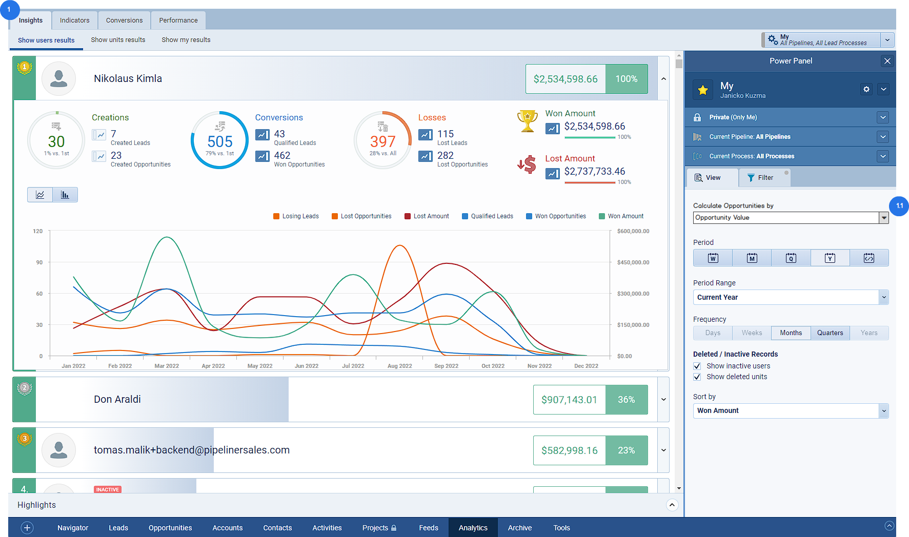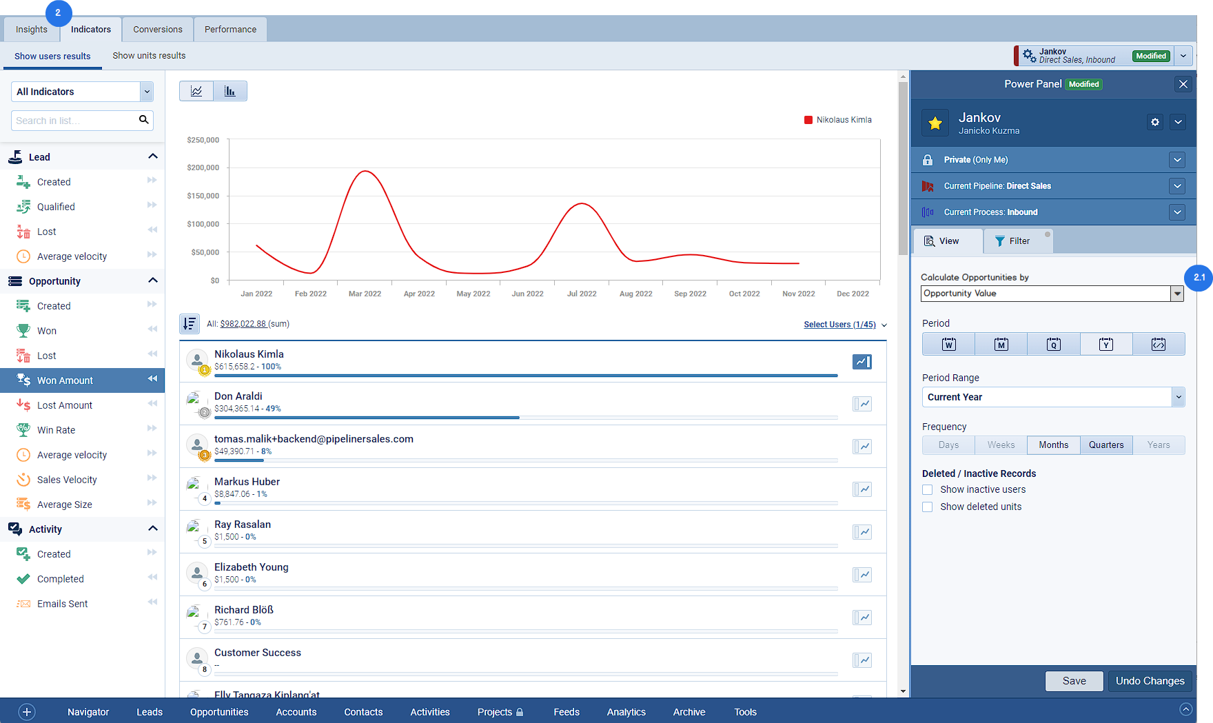 This feature introduces a new configuration option within the Insights “Power Panel“. It allows a user to select which numeric Opportunity field (including custom fields) should be used for all opportunity-related calculations across the Insights, Indicators, and Performance tabs. This replaces the previous hard-coded reliance on “Opportunity Value”.