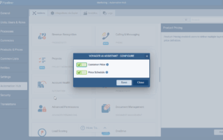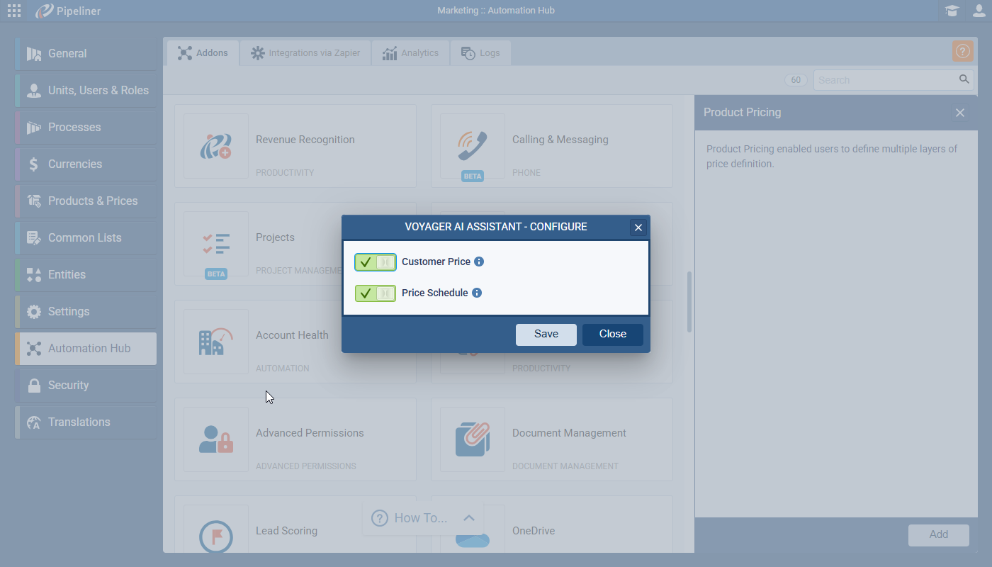 Product Pricing is enabled from the Automation Hub and the Admin can choose to use Customer Price and/or Price Schedule. Note that the selected option(s) control the visibility of other features (e.g., Account tab, Price Schedule admin).