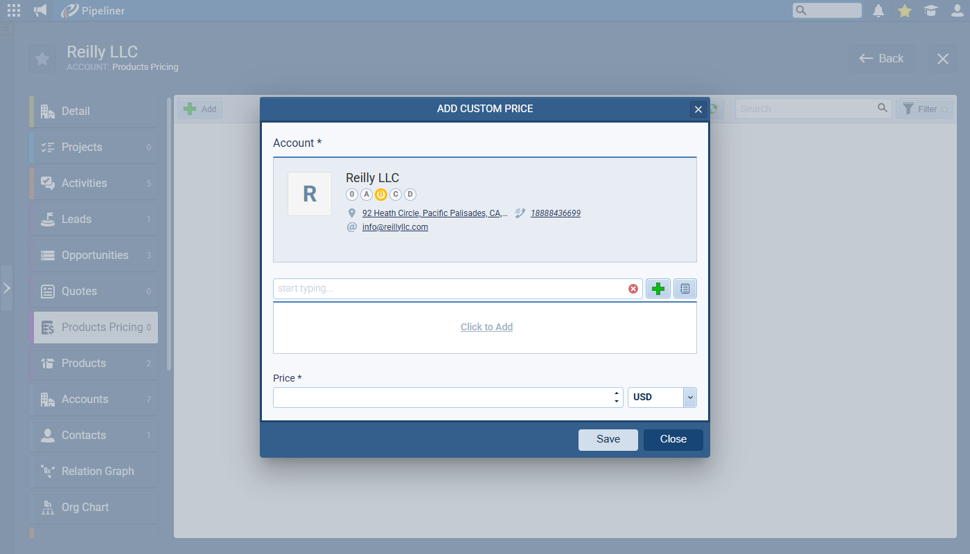 Users will click on “Add” to add a new custom price, the Account will be pre-selected and the userUser User means a person who uses or consumes a product or a service, usually a digital device or an online service. then needs to add the Product and the Price (0 is a valid value). On save, if the (Product, Currency) combination already exists for this Account, a message will show: “Customer Price for selected currency already exists.”