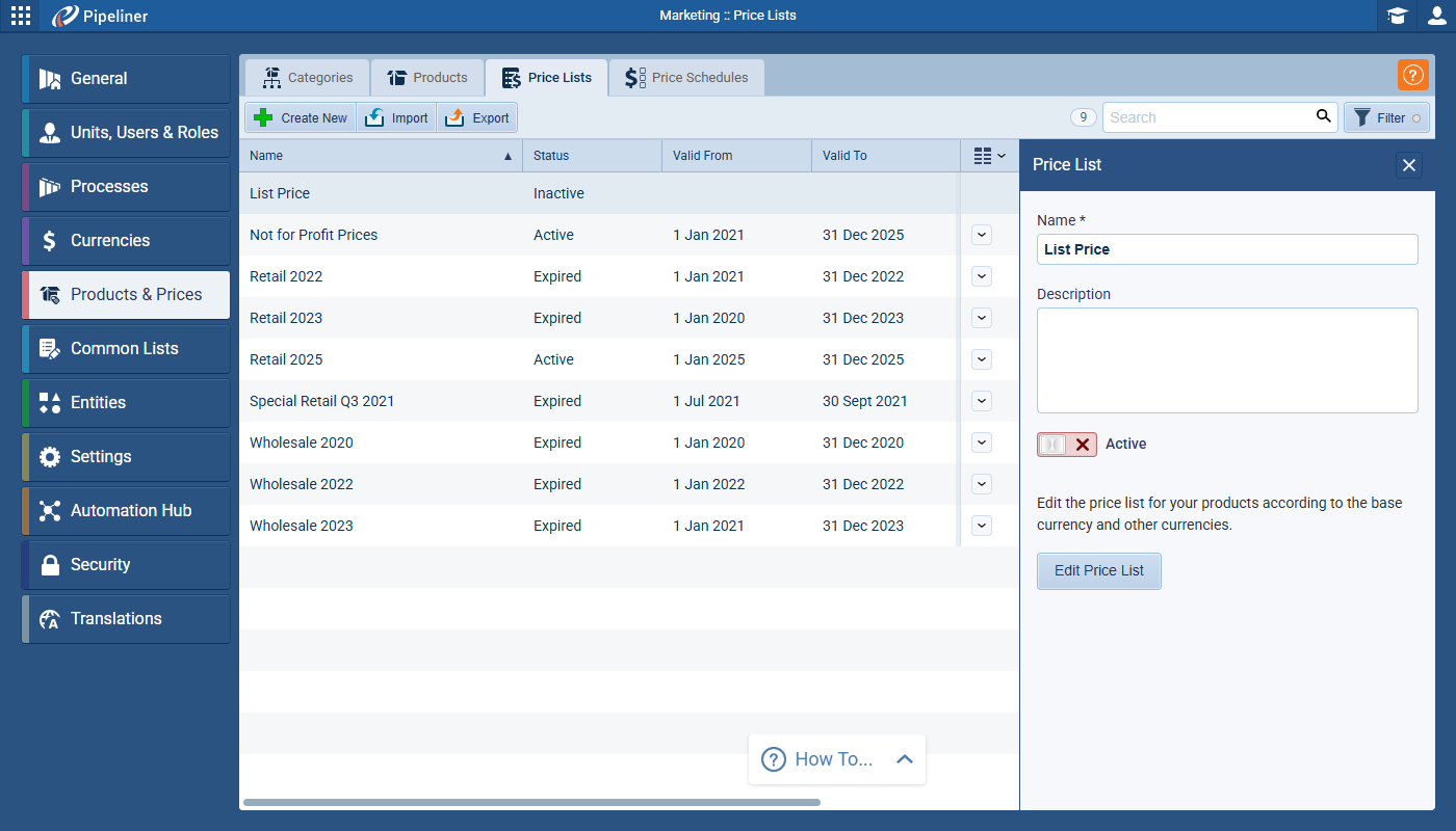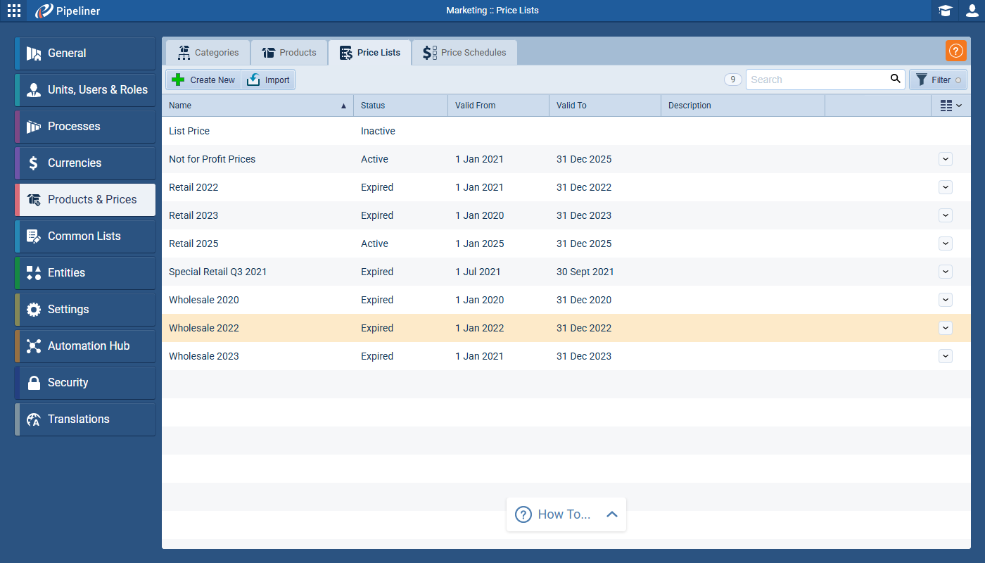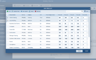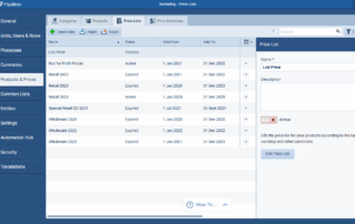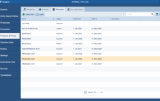 - Price lists with “Valid From”/”Valid To” (Sorted by “Valid To” closest to Today, then “Valid From” closest to Today).