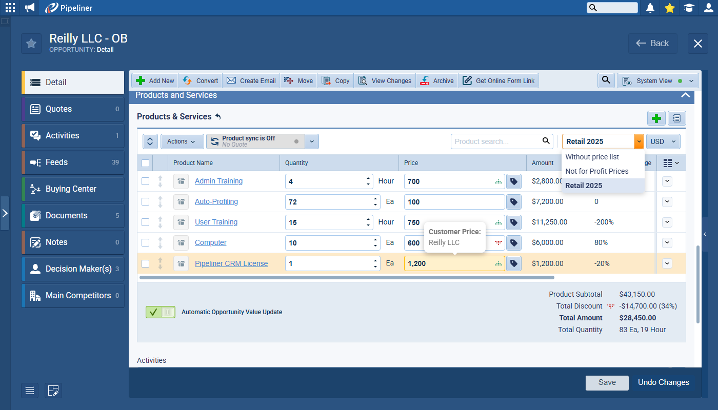 When creating a new Opportunity or Quote, the first price list after “Without price list” is selected by default. If a user manually selects a different price list, that selection is saved as a User Setting and becomes their default for new records.