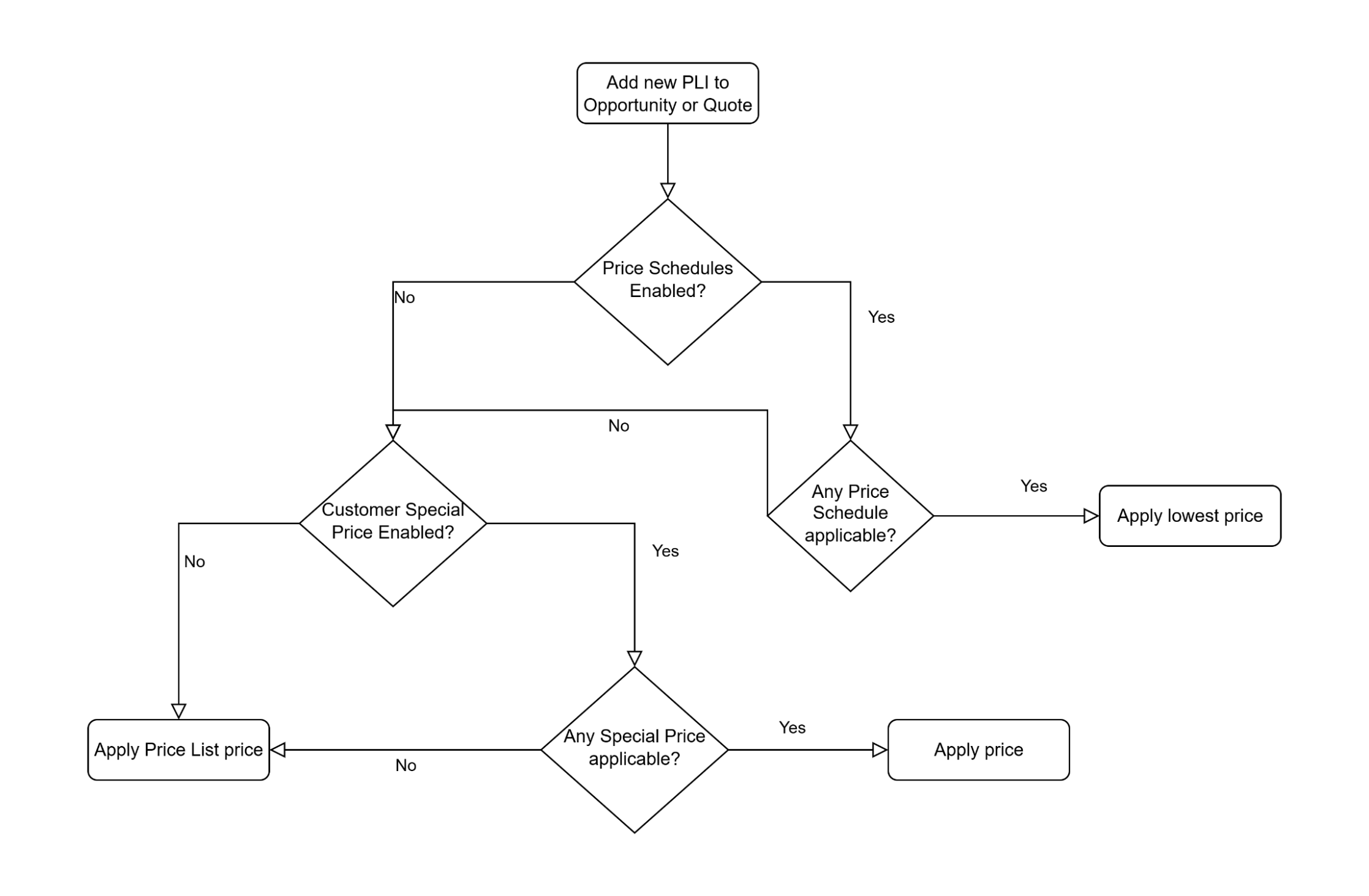 - This logic flow determines the prefilled price when a new Product Line Item (PLI) is added to an Opportunity/Quote.